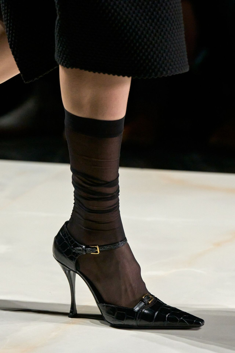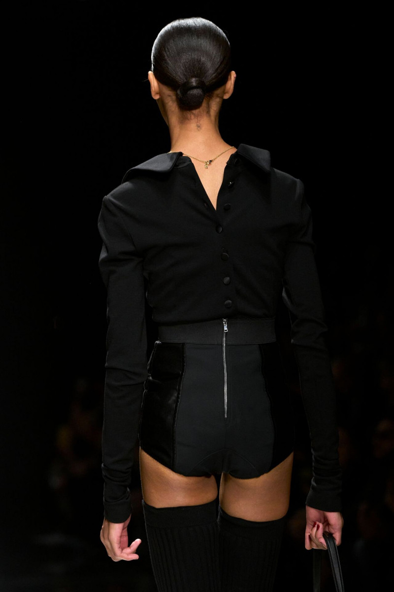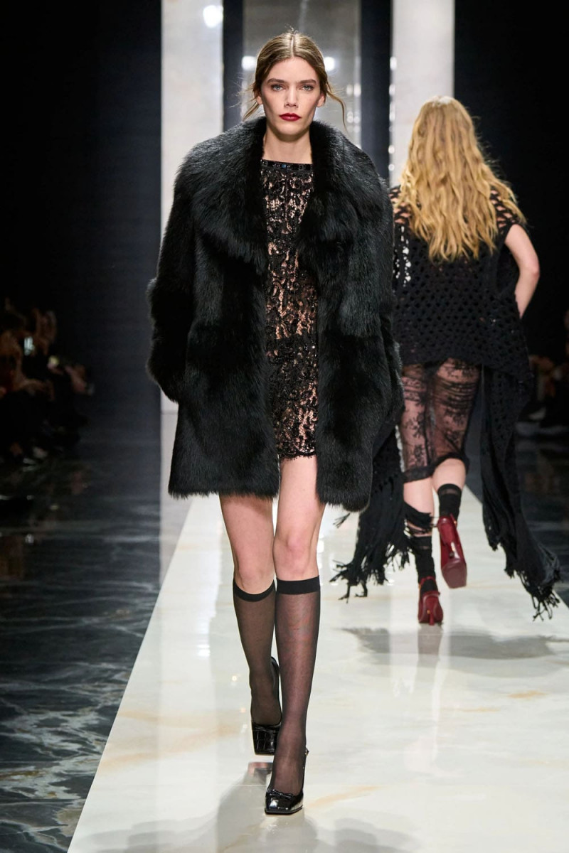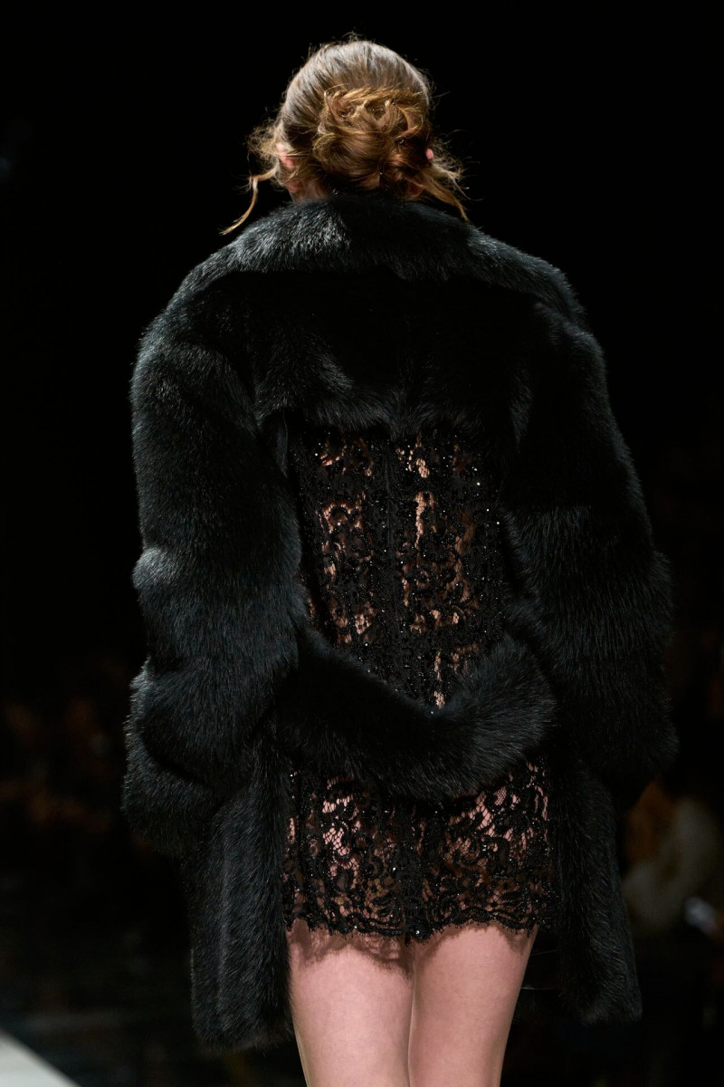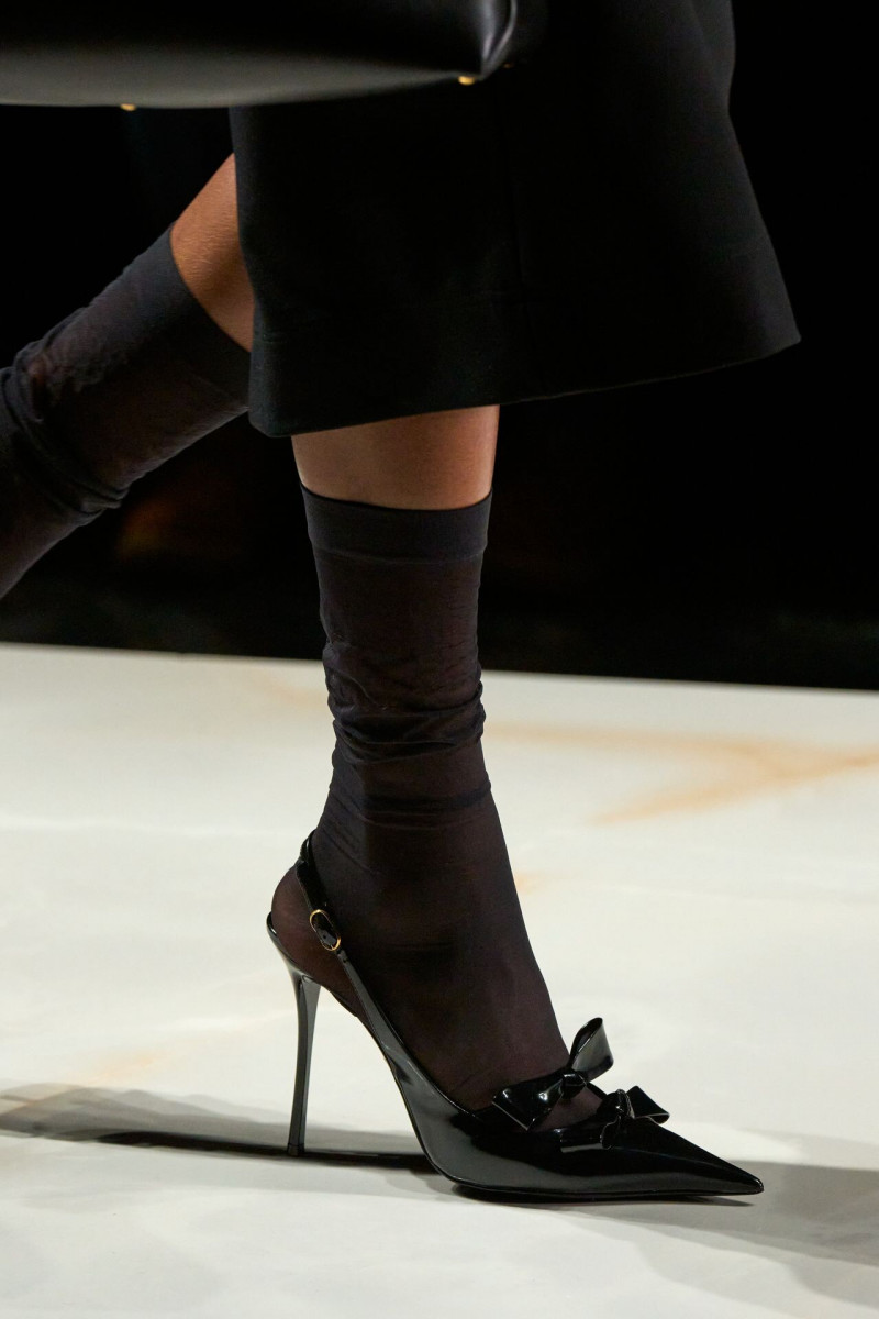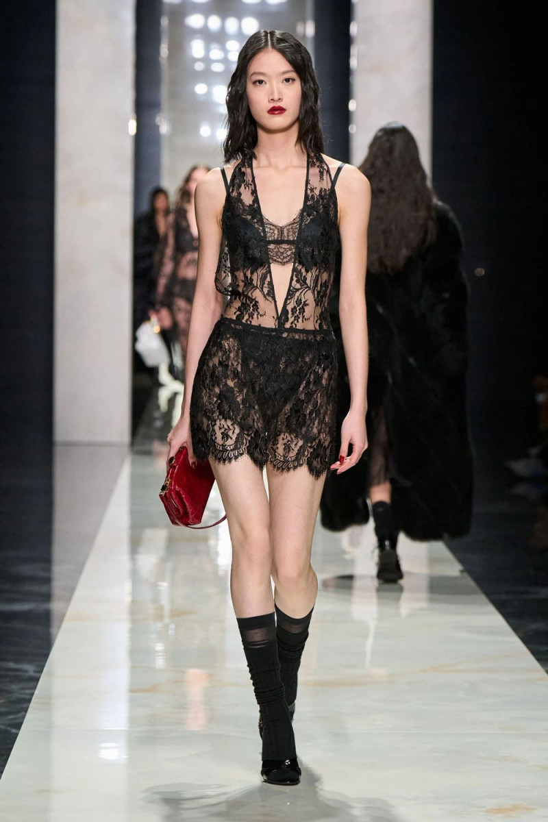 Затем следуют полупрозрачные платья, расшитые черным кружевом, отсылающие как к религиозной иконографии, так и к ночной соблазнительности. Эти образы несут в себе историческую память, но никогда не кажутся театральными. Они обнажают тело, сохраняя при этом его загадочность. Скульптурное черное платье с высоким воротником подчеркивает выразительность образа. Длинные рукава, аккуратные вытачки и скрытые разрезы создают почти монашеский силуэт, который нарушает лишь темно-красная лакированная сумка. Это напряжение между сдержанностью и искушением – квинтэссенция стиля Dolce & Gabbana.