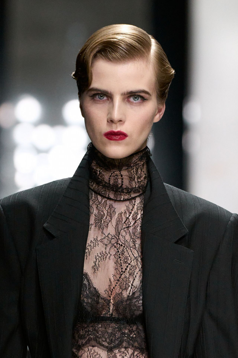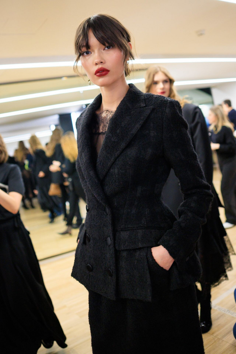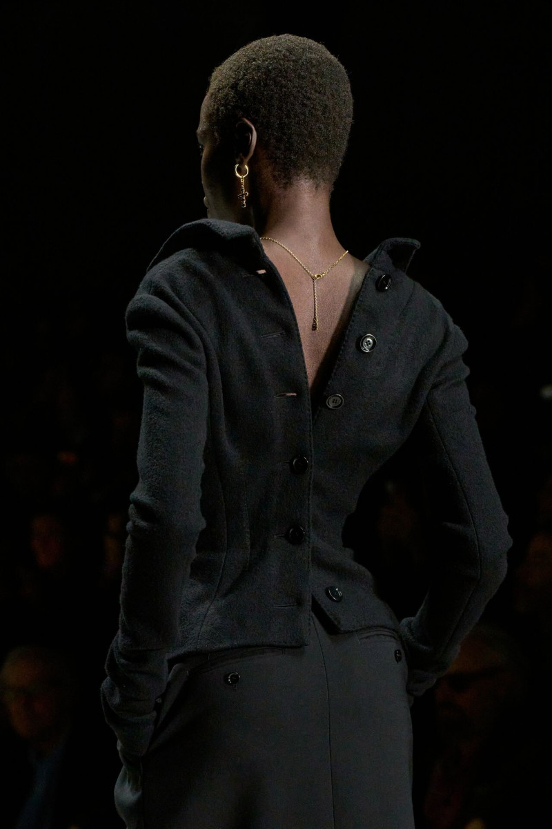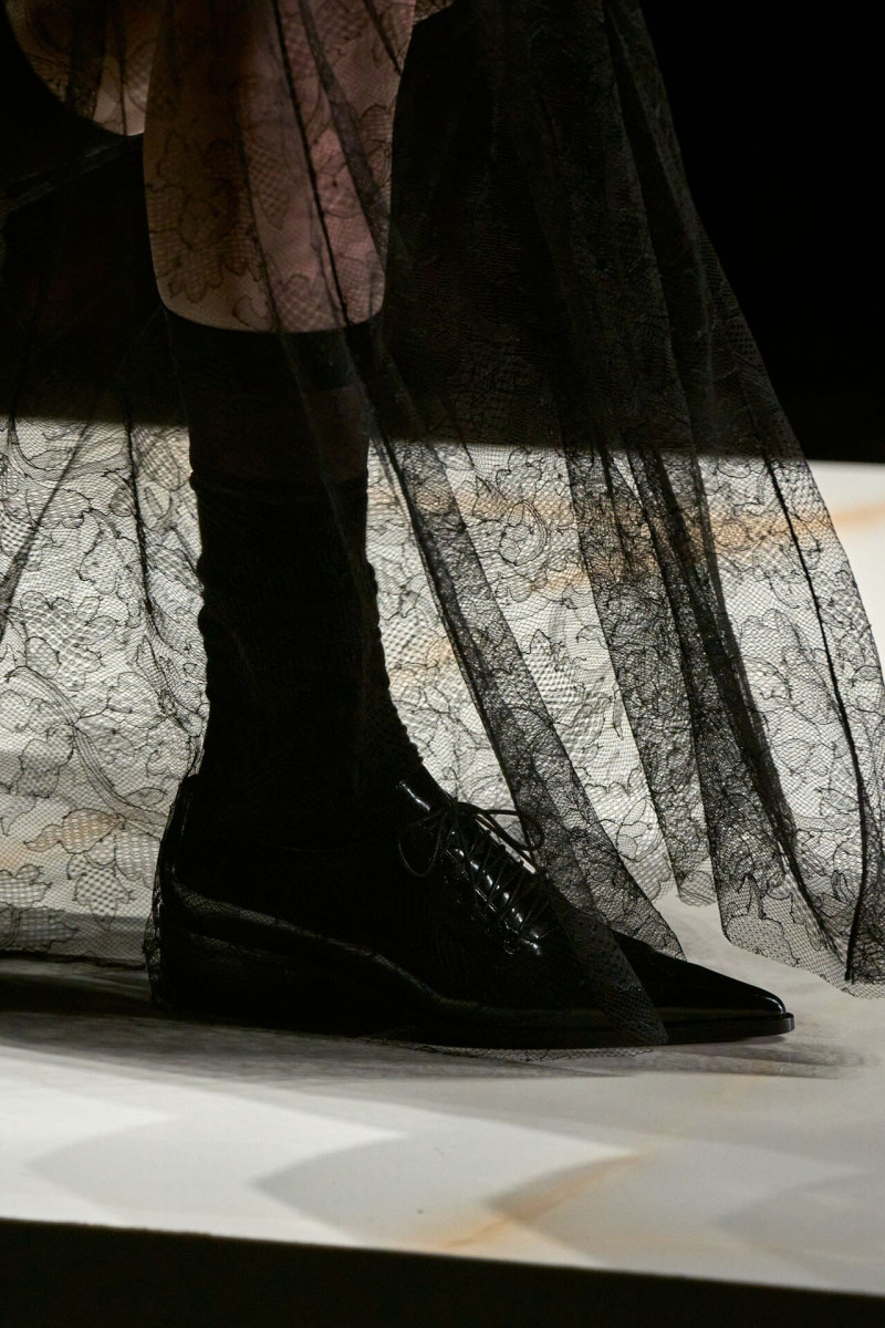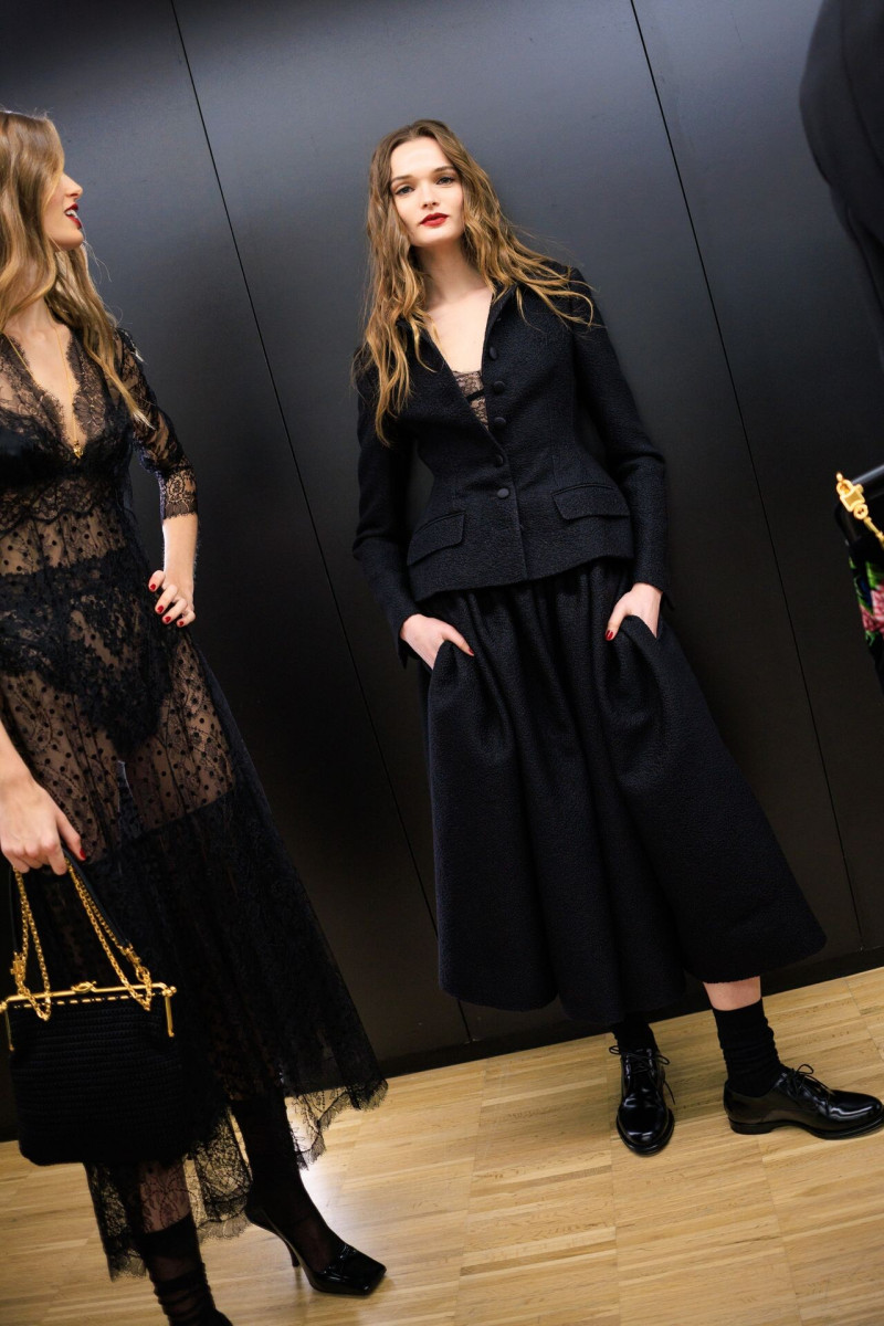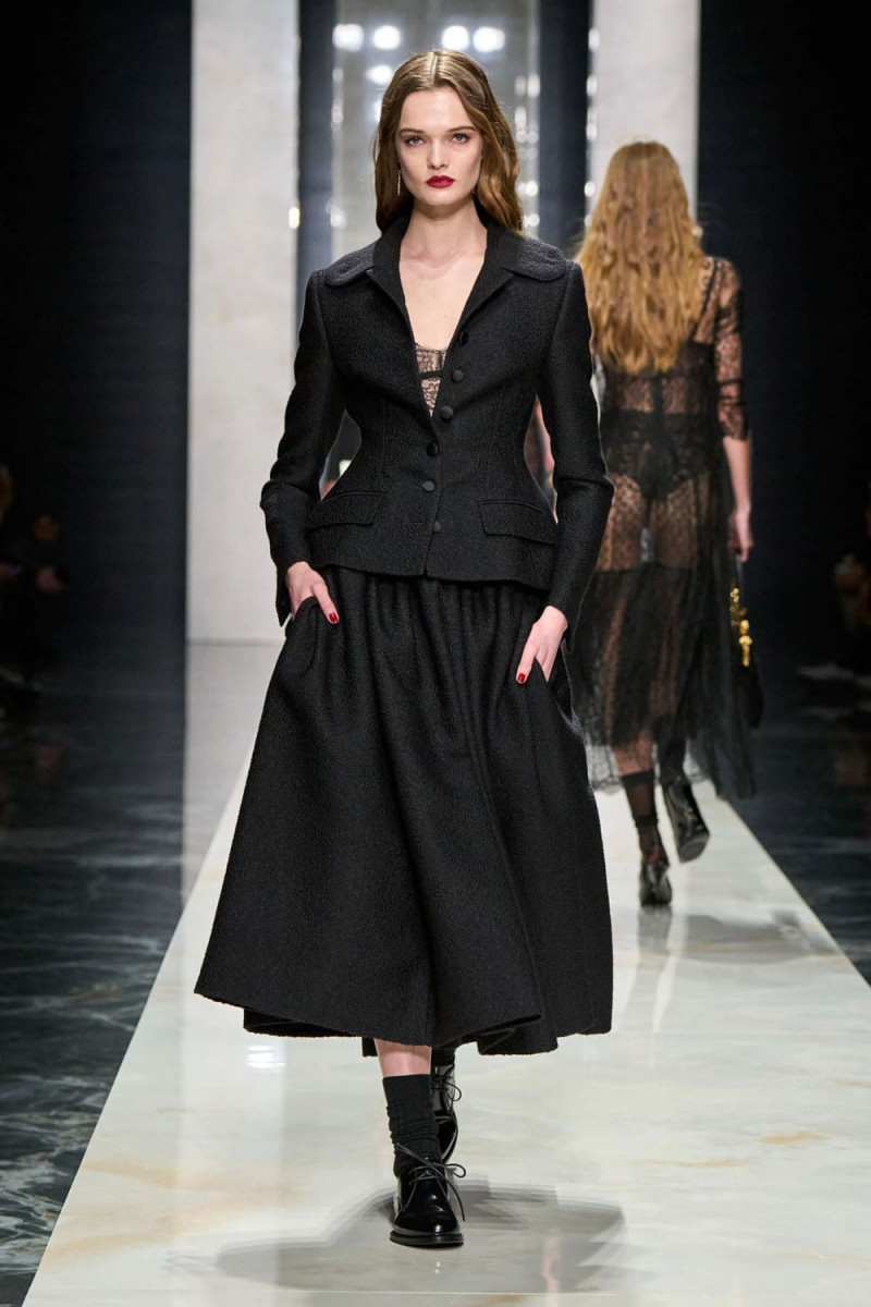 Финал возвращается к мягкости, но никогда не к хрупкости. Длинные черные платья, отделанные замысловатым кружевом, с мелкими цветочными принтами и скульптурными силуэтами, несут в себе тихую уверенность женщин, понимающих свою собственную силу. Отсылки к послевоенному периоду вновь находят отклик: восстановление, переосмысление, возвращение.
