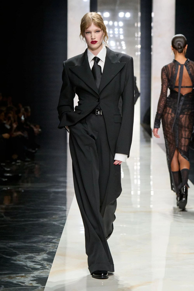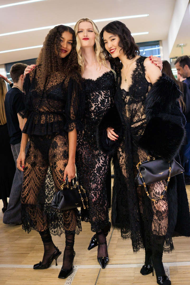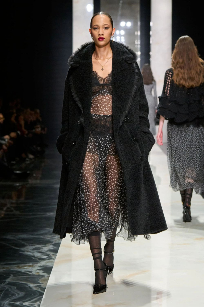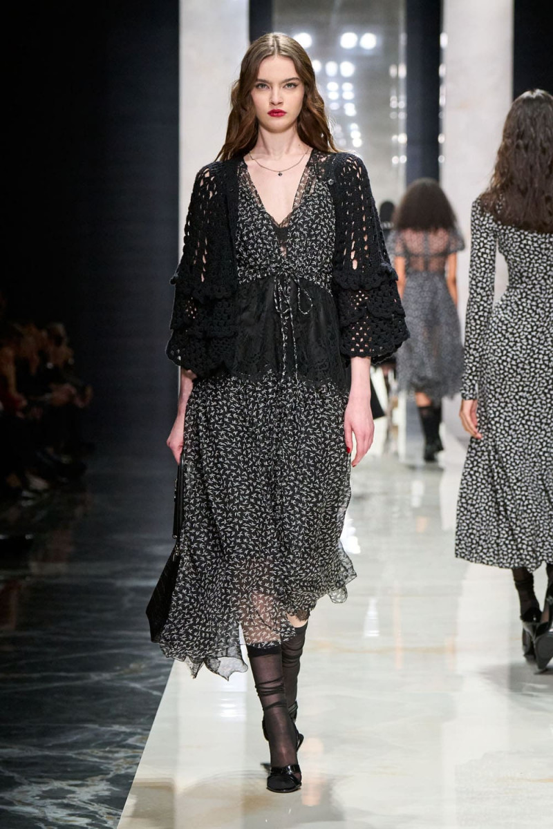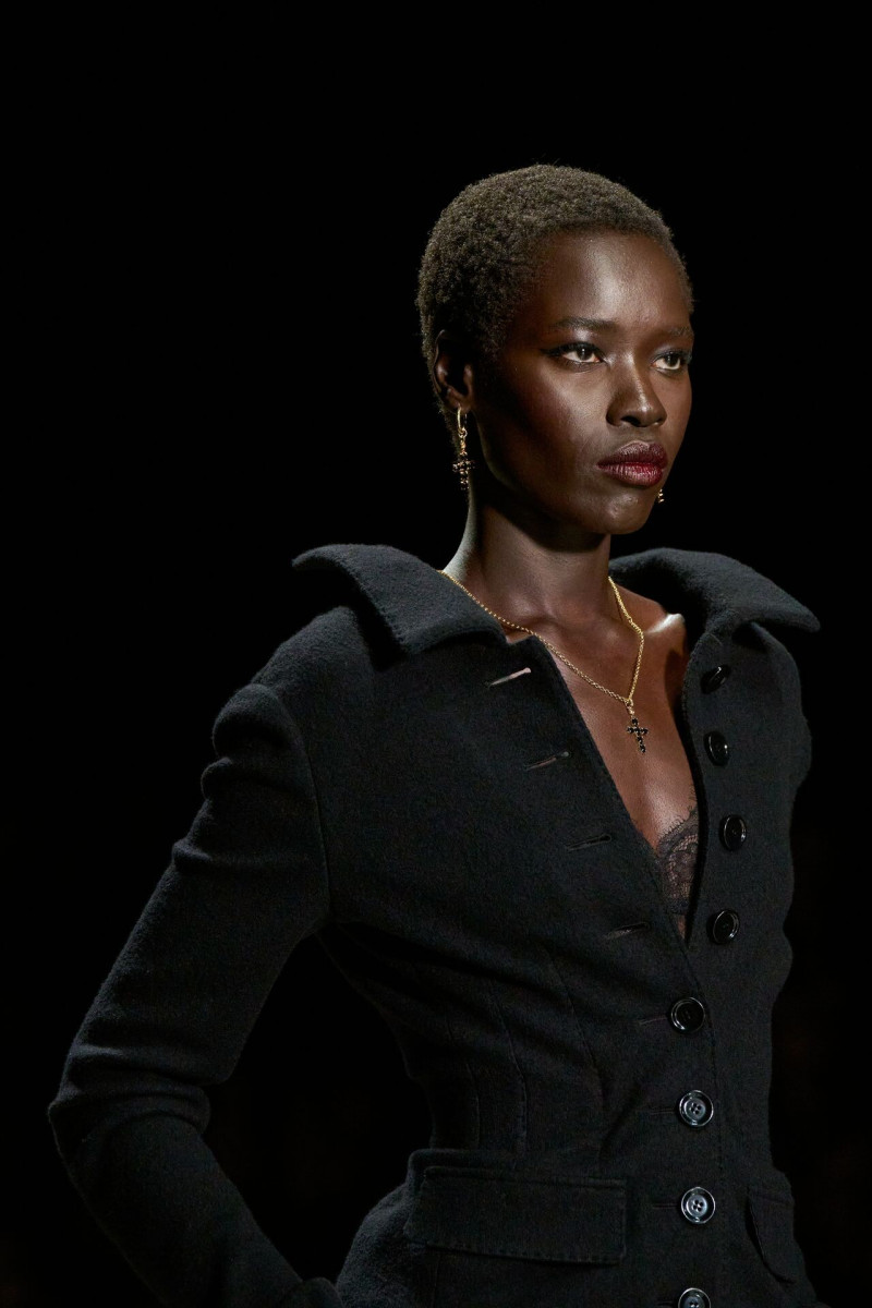Финал возвращается к мягкости, но никогда не к хрупкости. Длинные черные платья, отделанные замысловатым кружевом, с мелкими цветочными принтами и скульптурными силуэтами, несут в себе тихую уверенность женщин, понимающих свою собственную силу. Отсылки к послевоенному периоду вновь находят отклик: восстановление, переосмысление, возвращение.