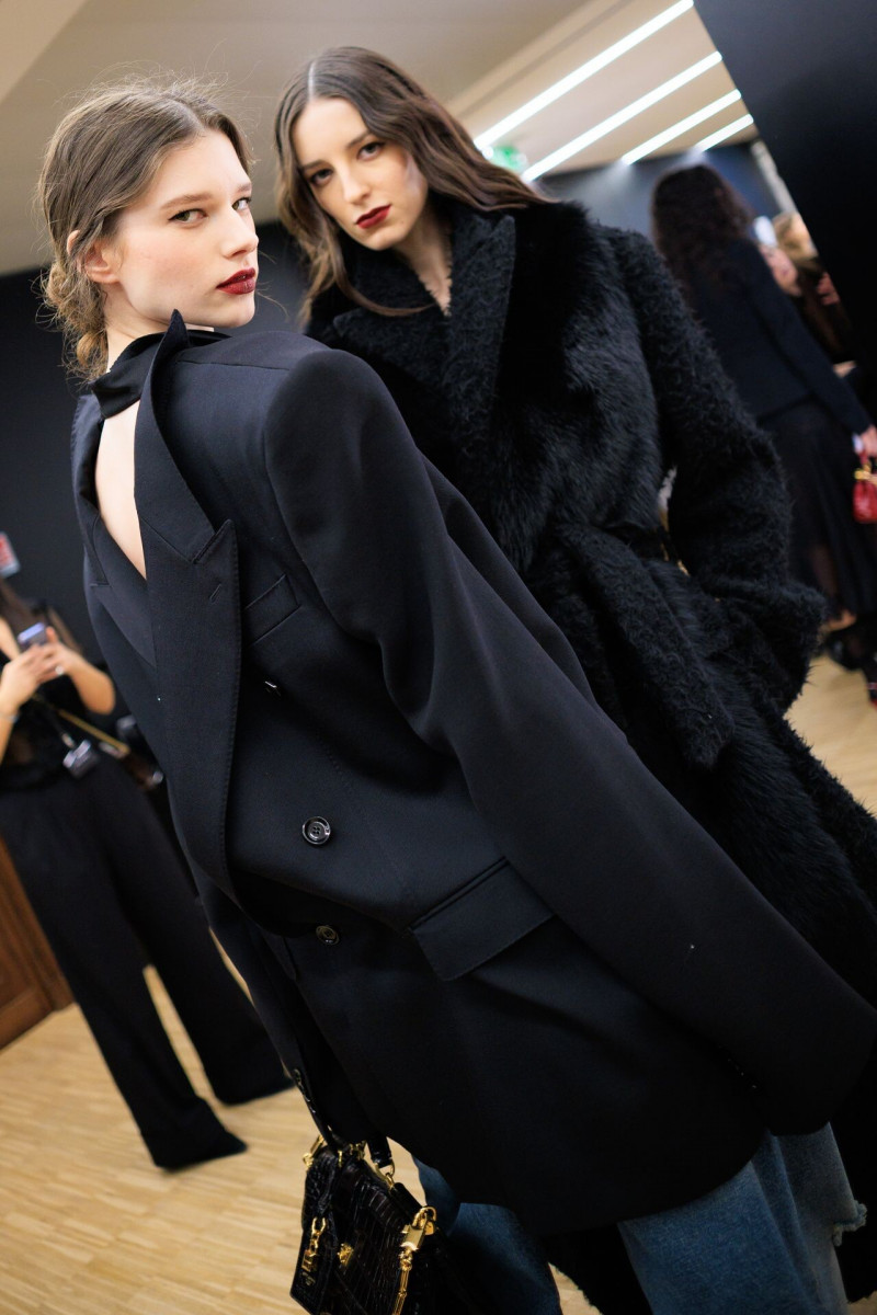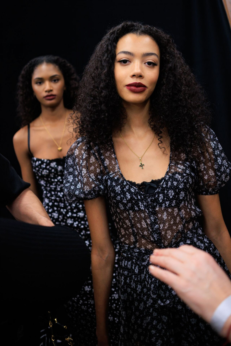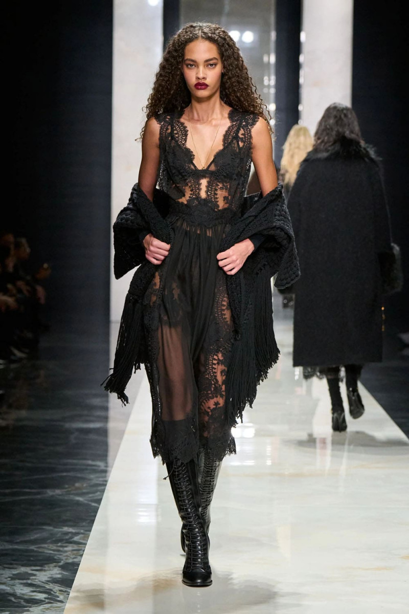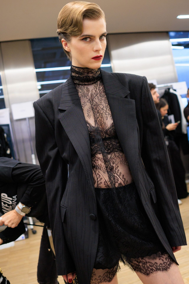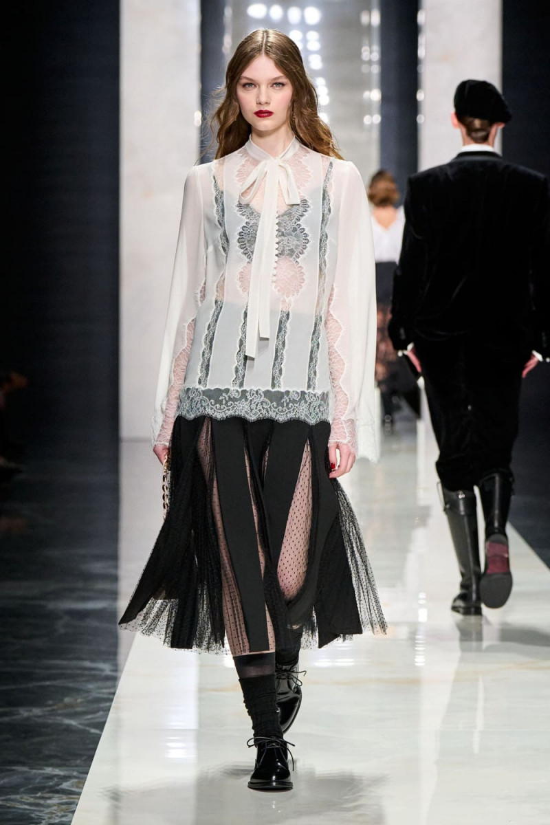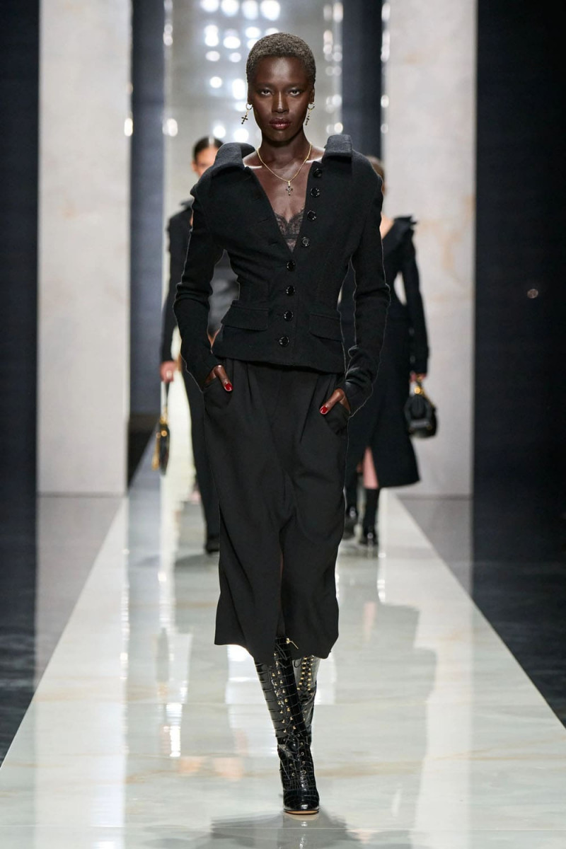 Финал возвращается к мягкости, но никогда не к хрупкости. Длинные черные платья, отделанные замысловатым кружевом, с мелкими цветочными принтами и скульптурными силуэтами, несут в себе тихую уверенность женщин, понимающих свою собственную силу. Отсылки к послевоенному периоду вновь находят отклик: восстановление, переосмысление, возвращение.