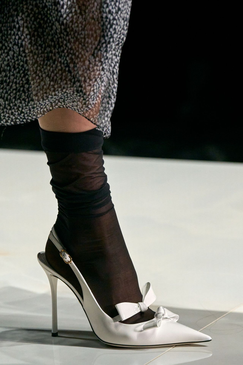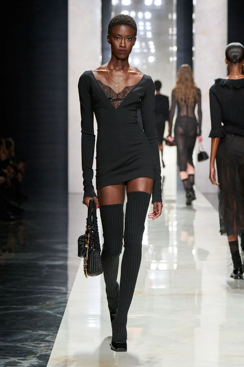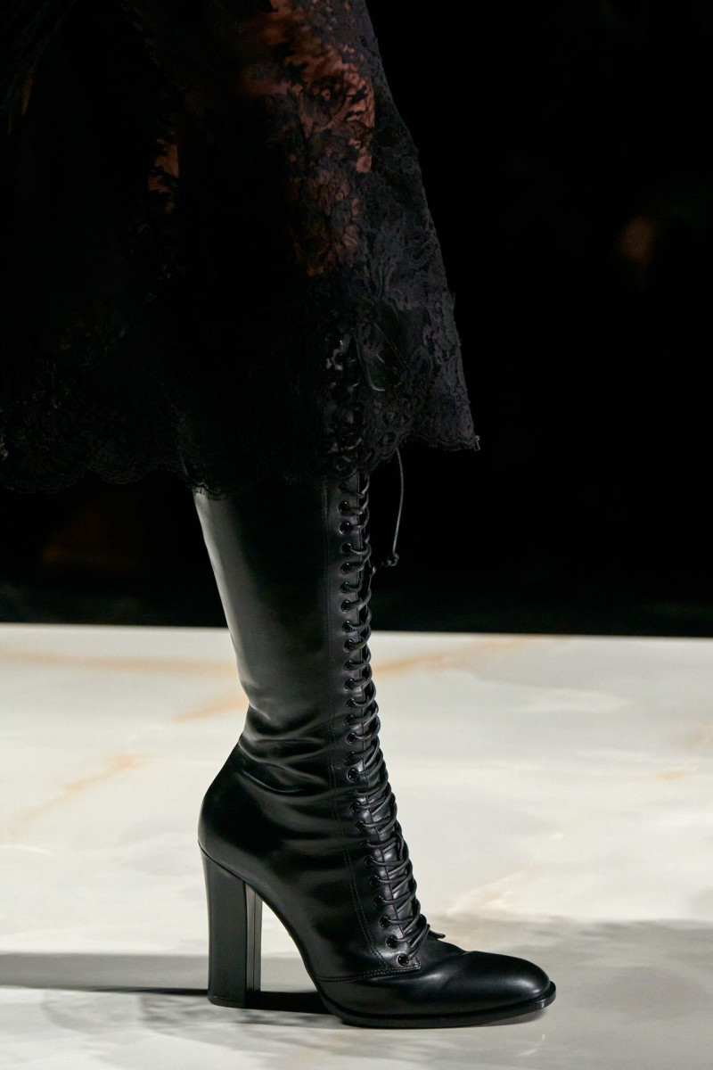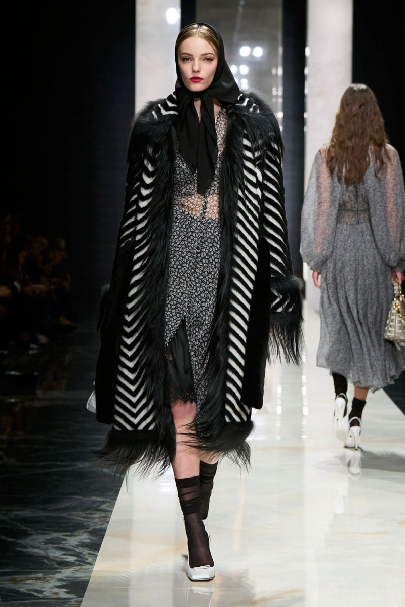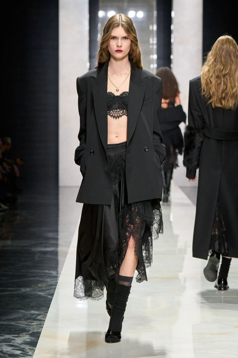 Финал возвращается к мягкости, но никогда не к хрупкости. Длинные черные платья, отделанные замысловатым кружевом, с мелкими цветочными принтами и скульптурными силуэтами, несут в себе тихую уверенность женщин, понимающих свою собственную силу. Отсылки к послевоенному периоду вновь находят отклик: восстановление, переосмысление, возвращение.