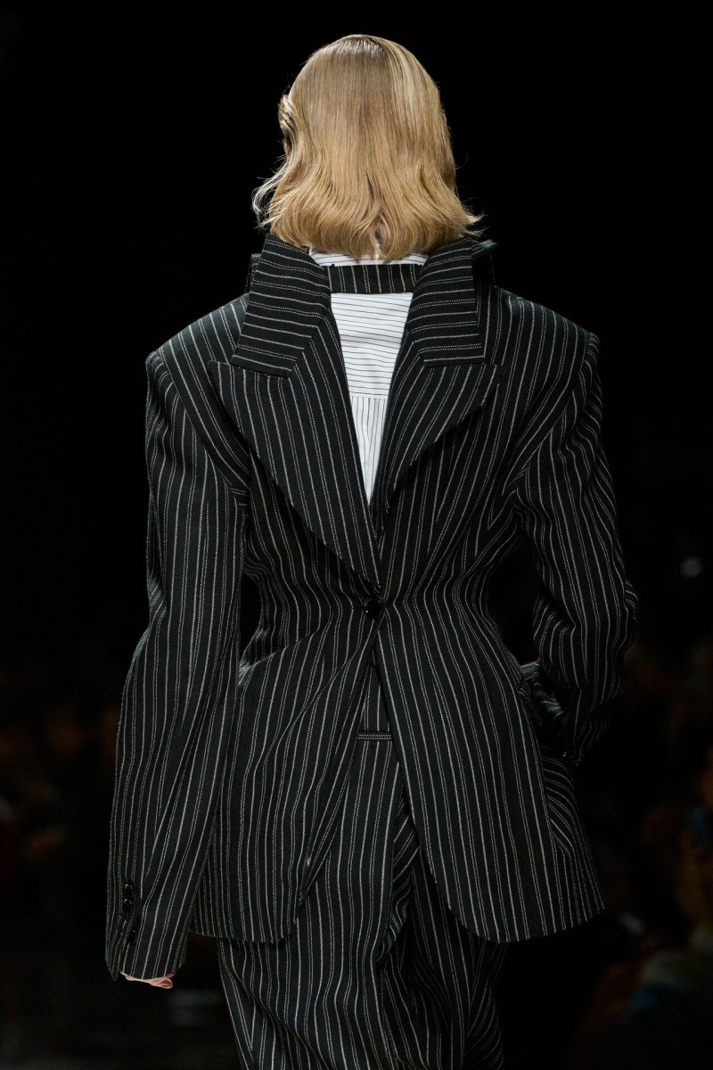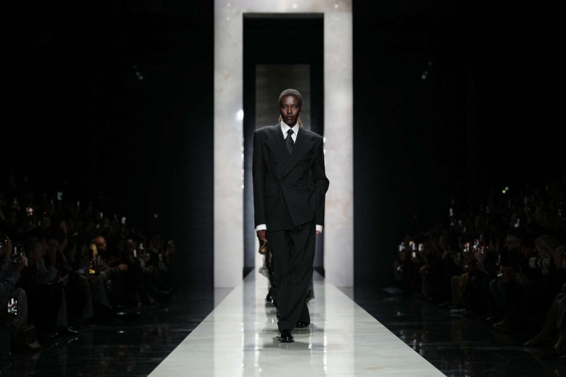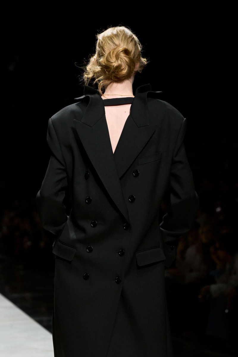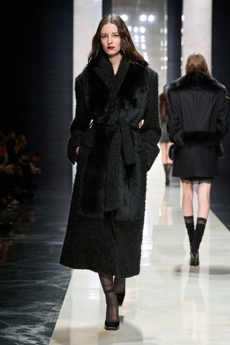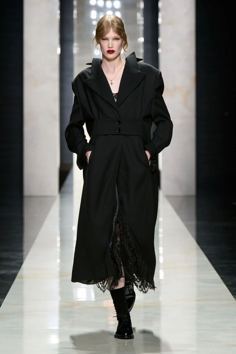 Показ открывается строгим, скульптурным кроем: длинное двубортное пальто с широким открытым вырезом, подчеркивающим силу, а не являющимся украшением. Плечи придают форму, а линия талии изящно изгибается, излучая неповторимую мягкость. Это первый признак главного напряжения коллекции — дисциплины, обрамленной желанием.