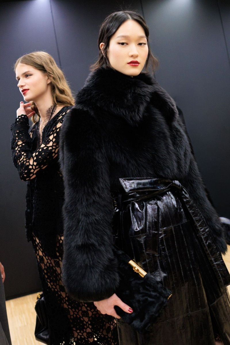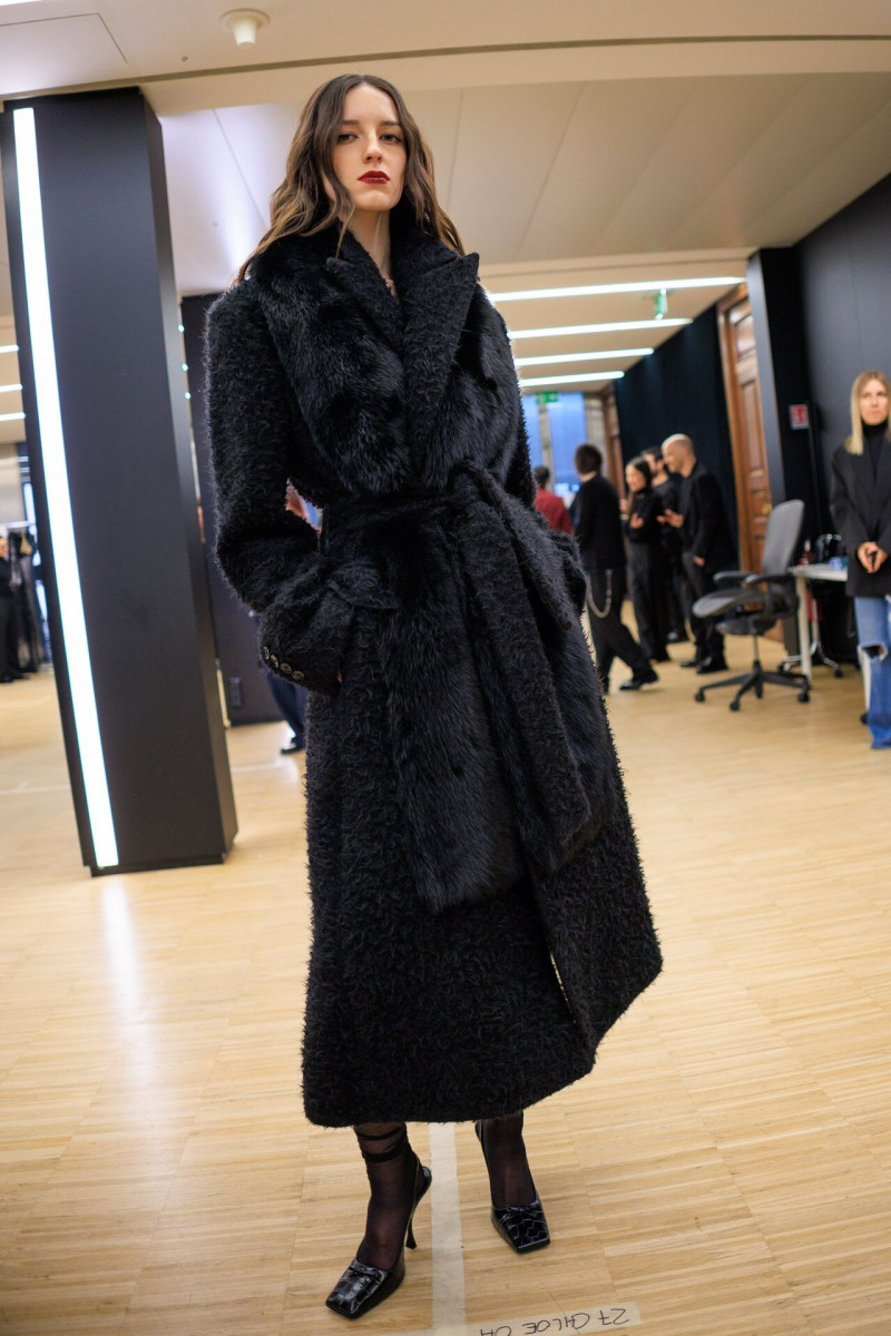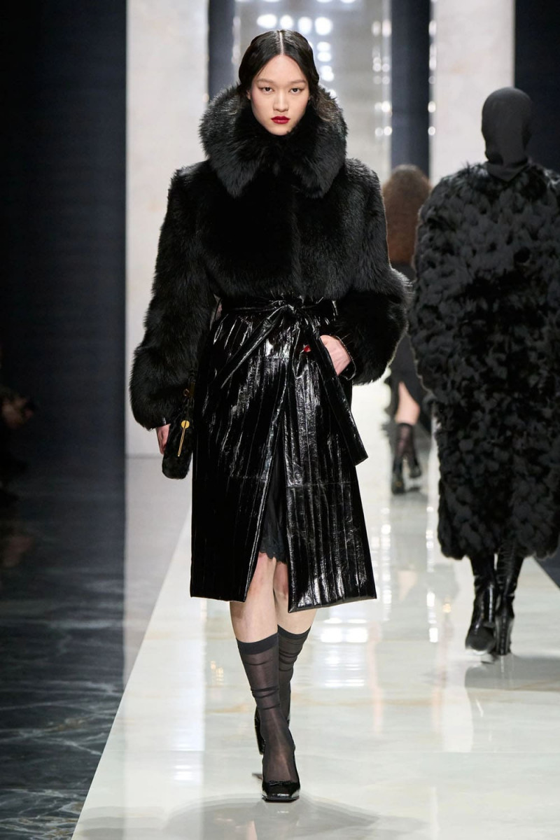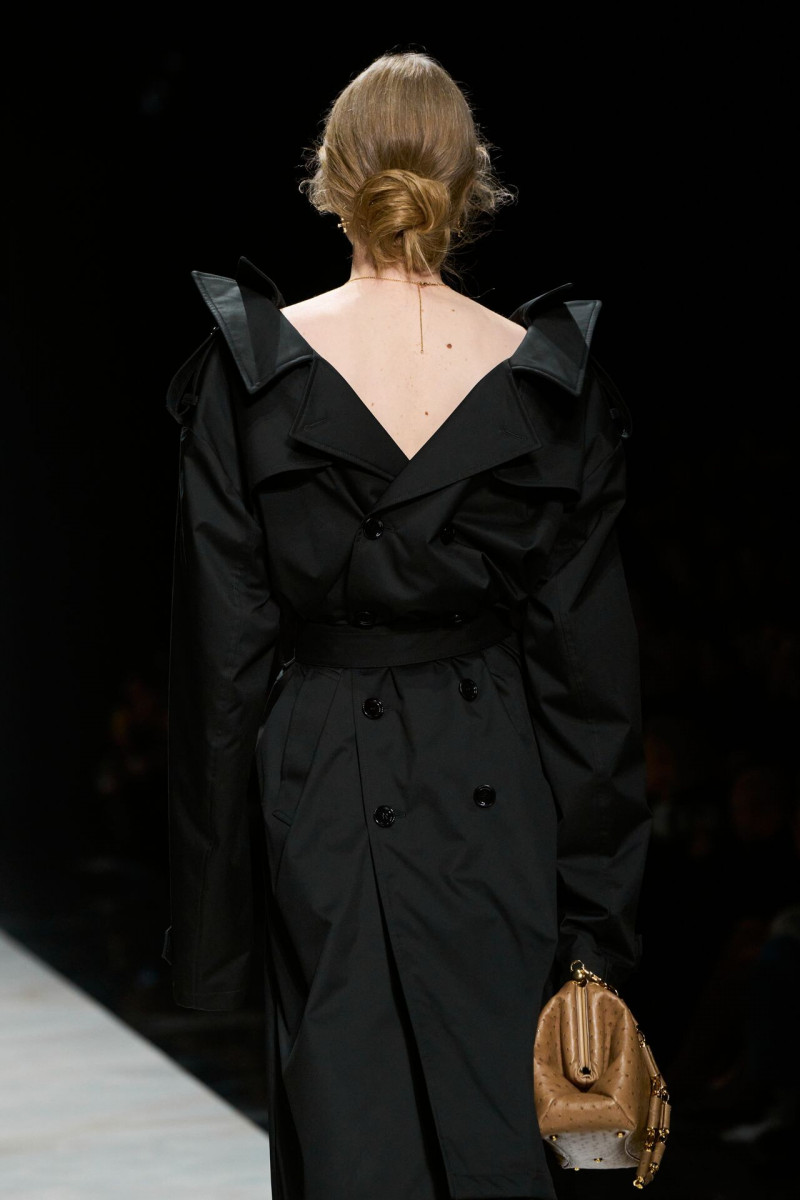 Показ открывается строгим, скульптурным кроем: длинное двубортное пальто с широким открытым вырезом, подчеркивающим силу, а не являющимся украшением. Плечи придают форму, а линия талии изящно изгибается, излучая неповторимую мягкость. Это первый признак главного напряжения коллекции — дисциплины, обрамленной желанием.