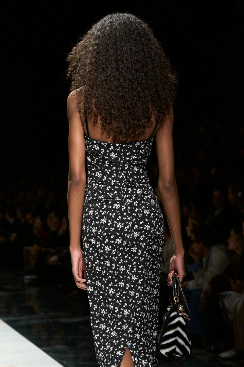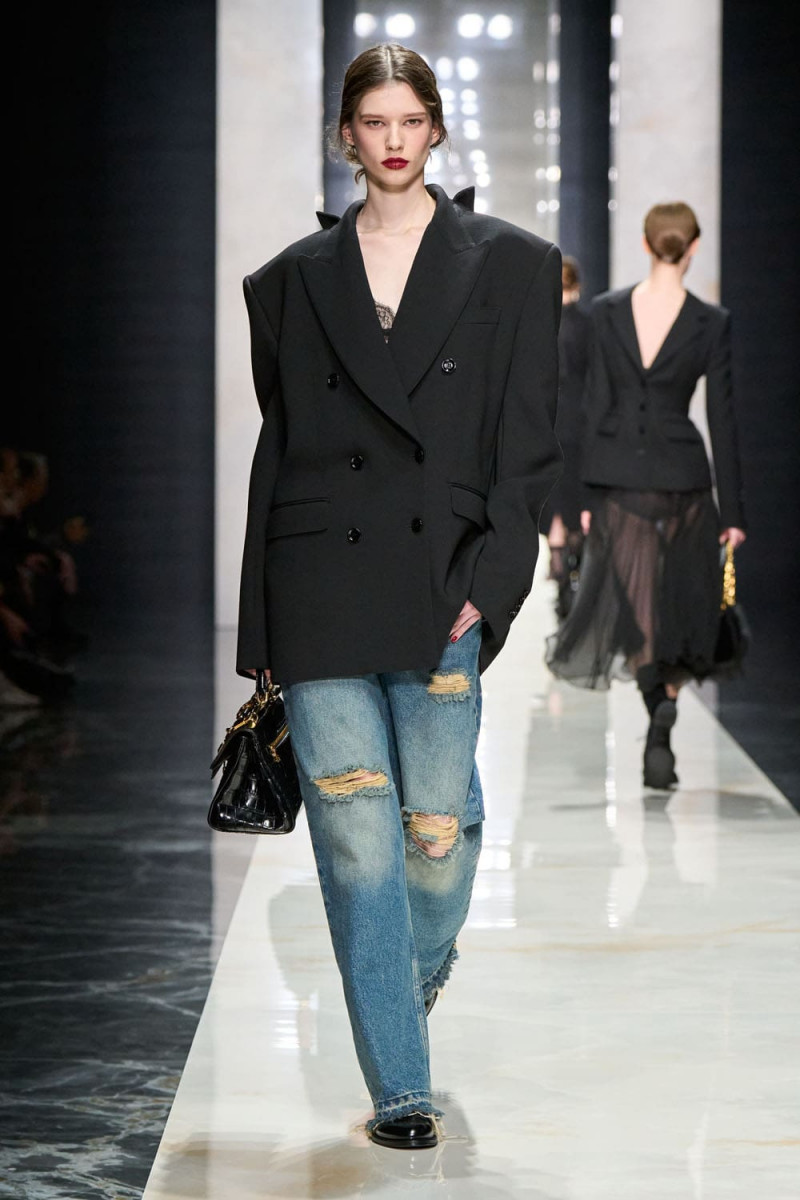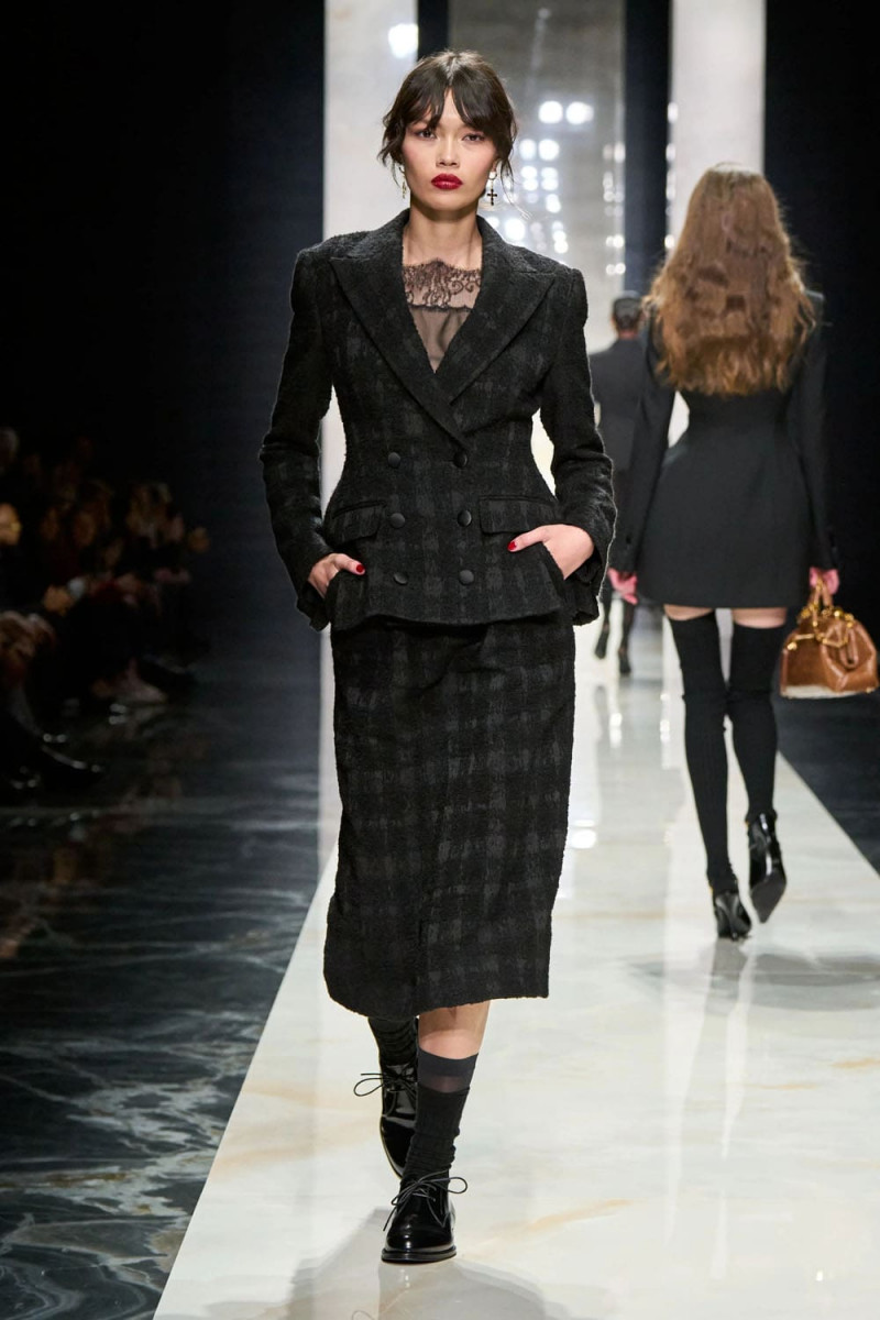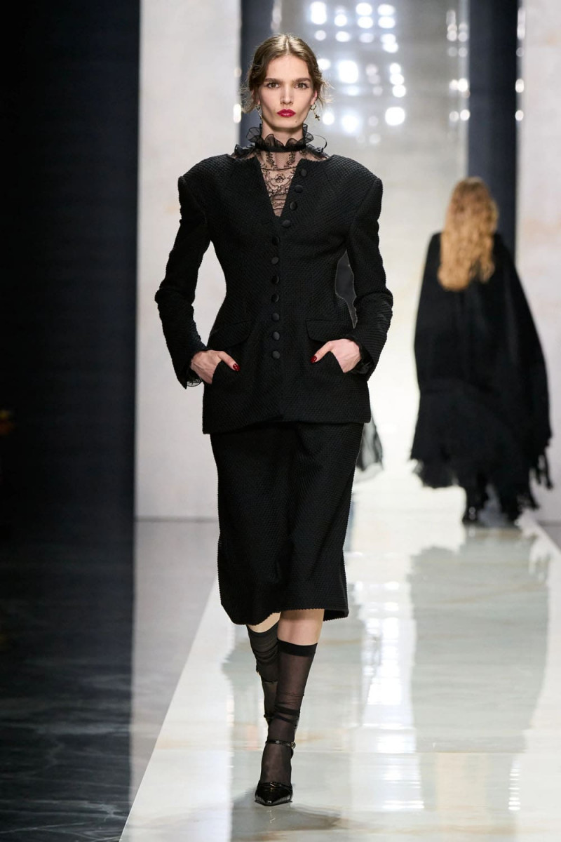 Затем следует безупречно приталенный жакет в сочетании с пышной фактурной юбкой. Пропорции кажутся почти литургическими, отсылая к послевоенным силуэтам, когда ткань была драгоценной, а форма — продуманной. Dolce & Gabbana переосмысливают эту историю не как ностальгию, а как символ силы: силуэт женщины, которая восстанавливает, принимает решения, заявляет о себе.