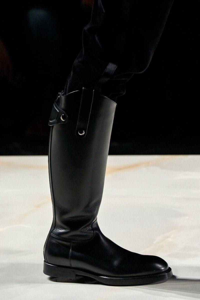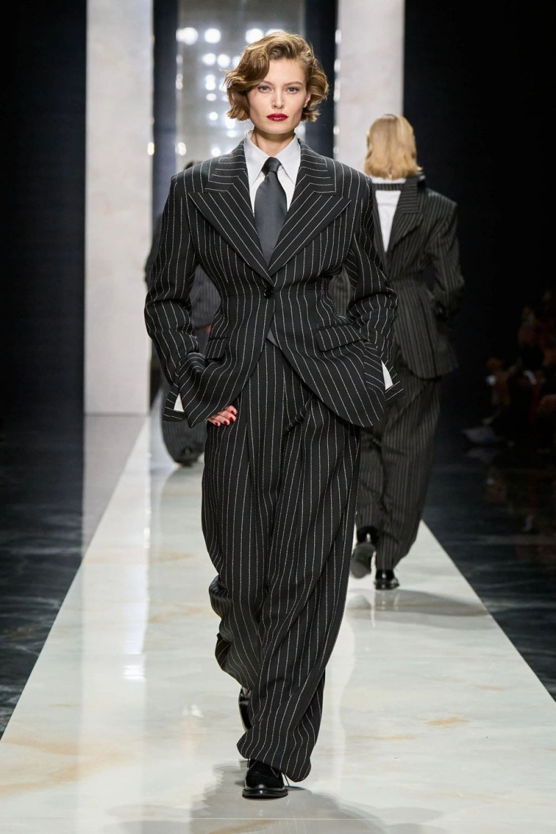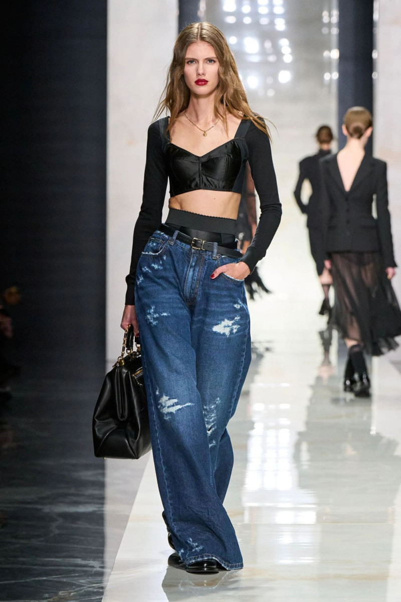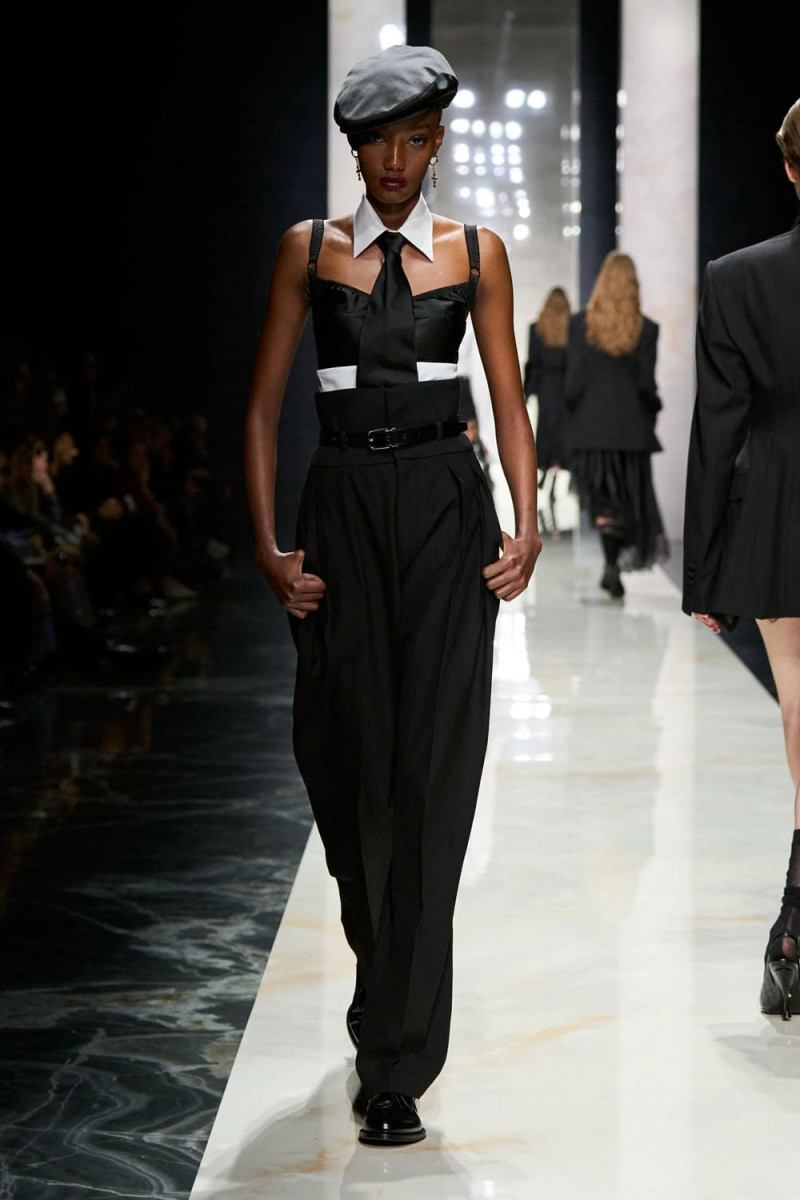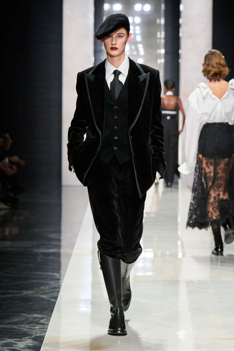 Затем следует безупречно приталенный жакет в сочетании с пышной фактурной юбкой. Пропорции кажутся почти литургическими, отсылая к послевоенным силуэтам, когда ткань была драгоценной, а форма — продуманной. Dolce & Gabbana переосмысливают эту историю не как ностальгию, а как символ силы: силуэт женщины, которая восстанавливает, принимает решения, заявляет о себе.