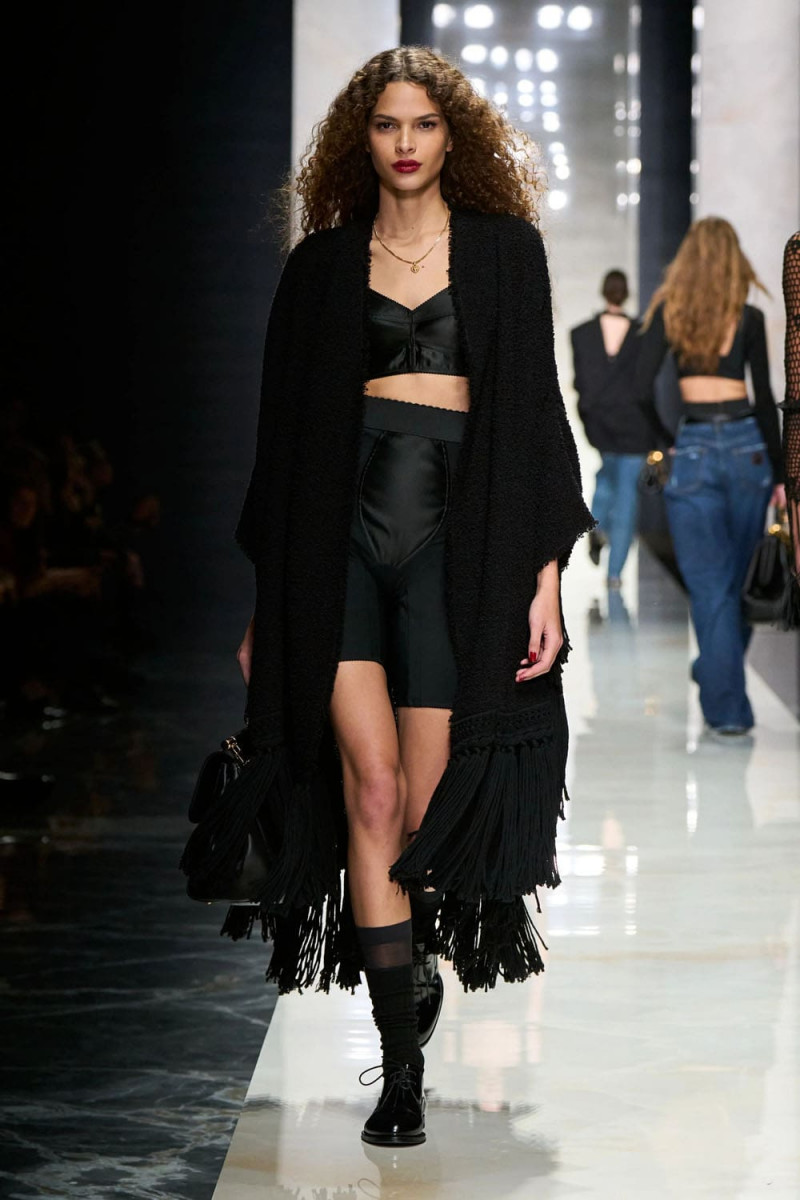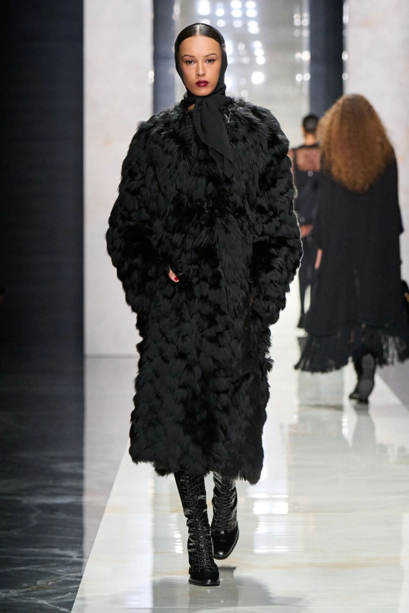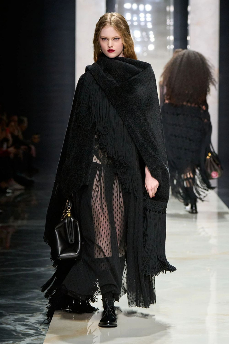 Мужской крой вступает в диалог с приталенным черным жакетом, надетым как платье, в сочетании с чулками в рубчик до бедра. Послание ясно: структура не умаляет женственности; она определяет ее на ее условиях. Шаг мощный, поза безошибочно современная. Бахрома становится одним из определяющих элементов сезона. Драпированные шали, юбки и накидки движутся в драматическом ритме, напоминая одновременно траурные вуали и праздничные костюмы — двойственность, отражающая эмоциональную структуру показа. Бахрома здесь — не украшение; это язык. Она выражает движение, переход, эволюцию.