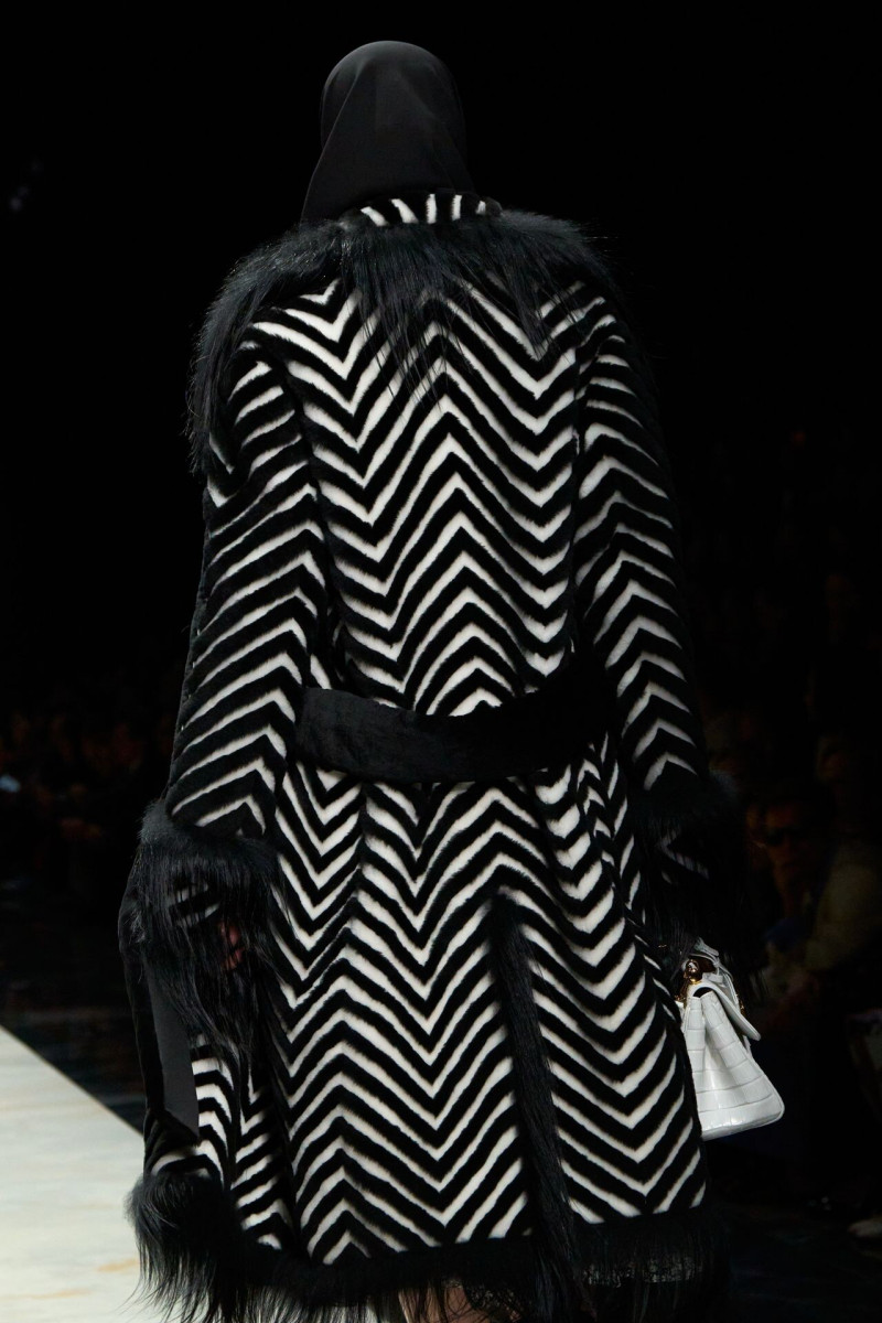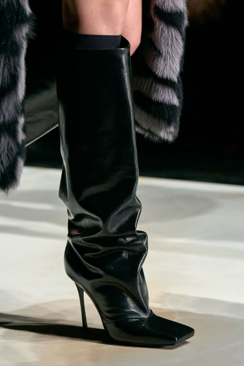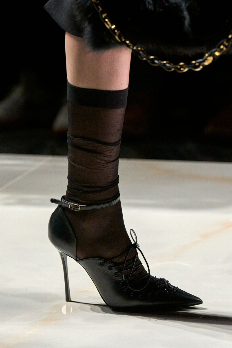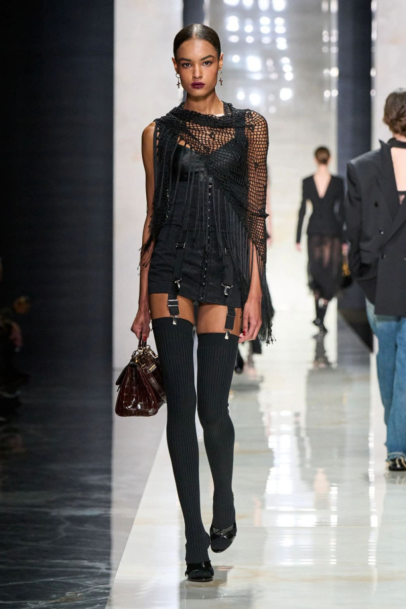 Мужской крой вступает в диалог с приталенным черным жакетом, надетым как платье, в сочетании с чулками в рубчик до бедра. Послание ясно: структура не умаляет женственности; она определяет ее на ее условиях. Шаг мощный, поза безошибочно современная. Бахрома становится одним из определяющих элементов сезона. Драпированные шали, юбки и накидки движутся в драматическом ритме, напоминая одновременно траурные вуали и праздничные костюмы — двойственность, отражающая эмоциональную структуру показа. Бахрома здесь — не украшение; это язык. Она выражает движение, переход, эволюцию.