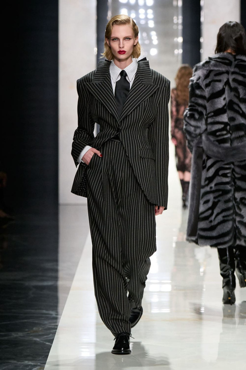 Мужские стереотипы усиливаются: костюмы в тонкую полоску с широкими плечами, белоснежные рубашки и узкие галстуки. Однако на этих женщинах костюмы никогда не заимствуют мужественность; они её впитывают. Крой становится инструментом авторитета, а не подражанием.