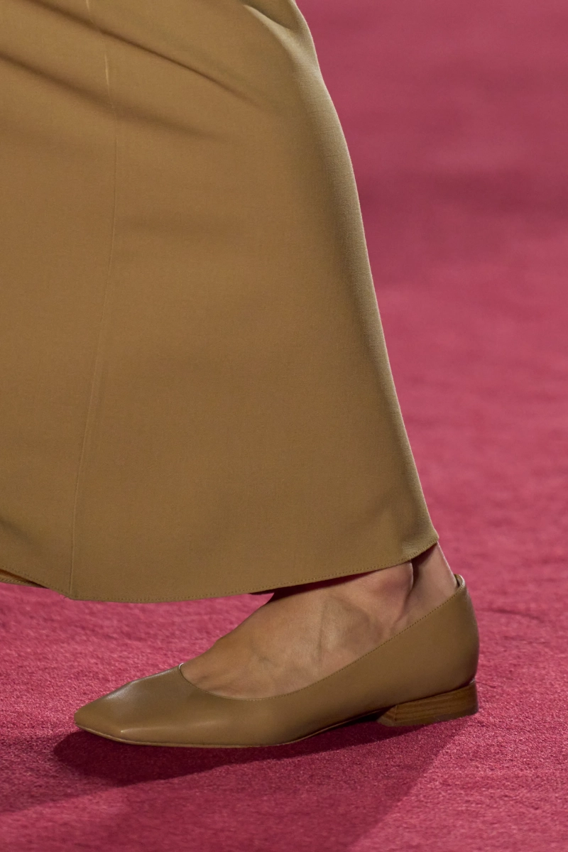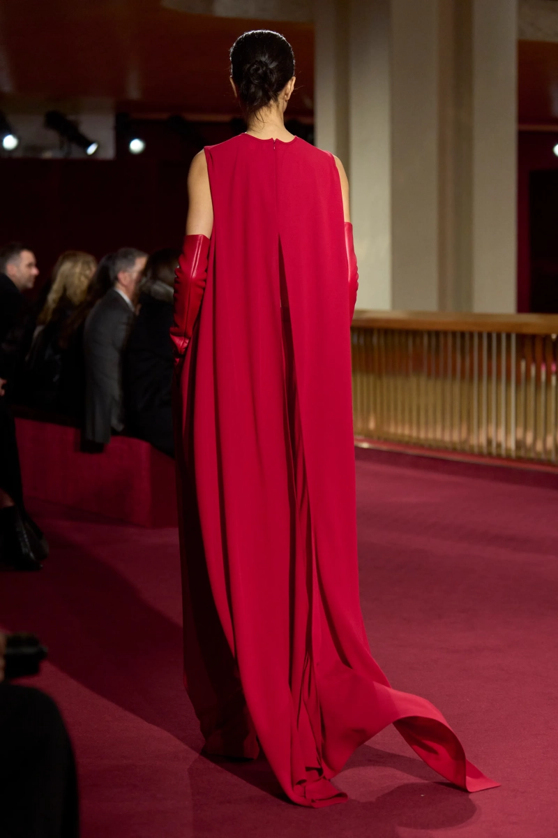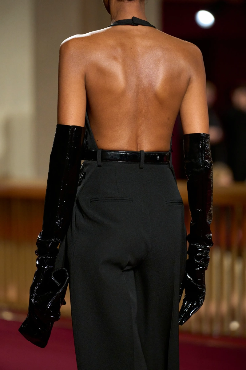 Палитра и основные элементы усиливали ощущение непрерывности. Черные водолазки, верблюжьи пальто, безупречно белые рубашки и черные платья — четыре столпа, которые Корс в шутку называет своей «королевской битвой», — все присутствовали, но редко в самой буквальной форме. Некоторые водолазки появлялись в виде накладок (декки), накладывавшихся под пиджаки, чтобы сохранять тепло и форму без визуальной тяжести. Эта идея легкости через наслоение была ключевой для тактильной логики коллекции: одежда строилась слоями, но никогда не ощущалась громоздкой или ограничивающей, сохраняя чувство плавной городской мобильности.