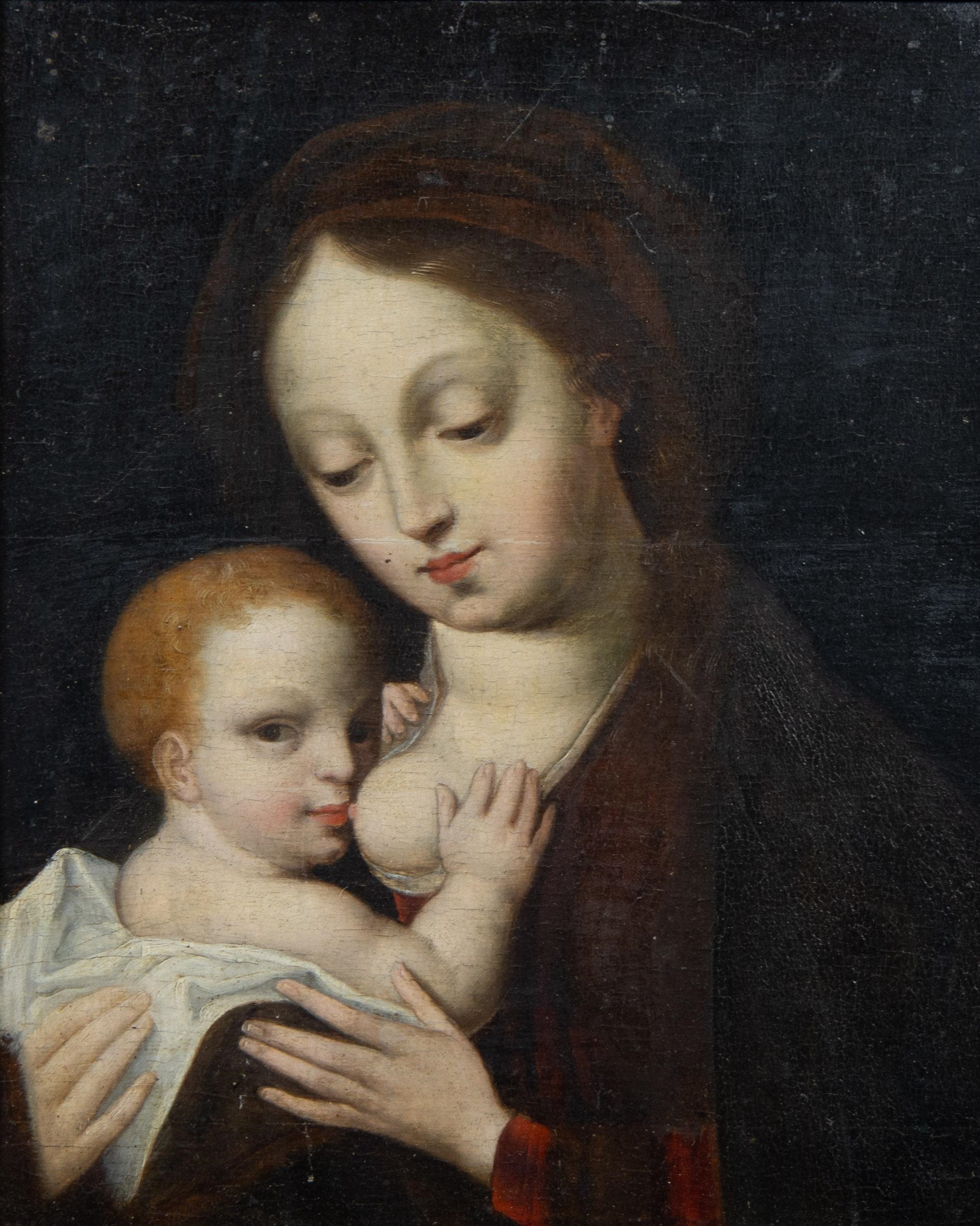The Virgin breastfeeding the christ child, at half-length against a brocade drapery.