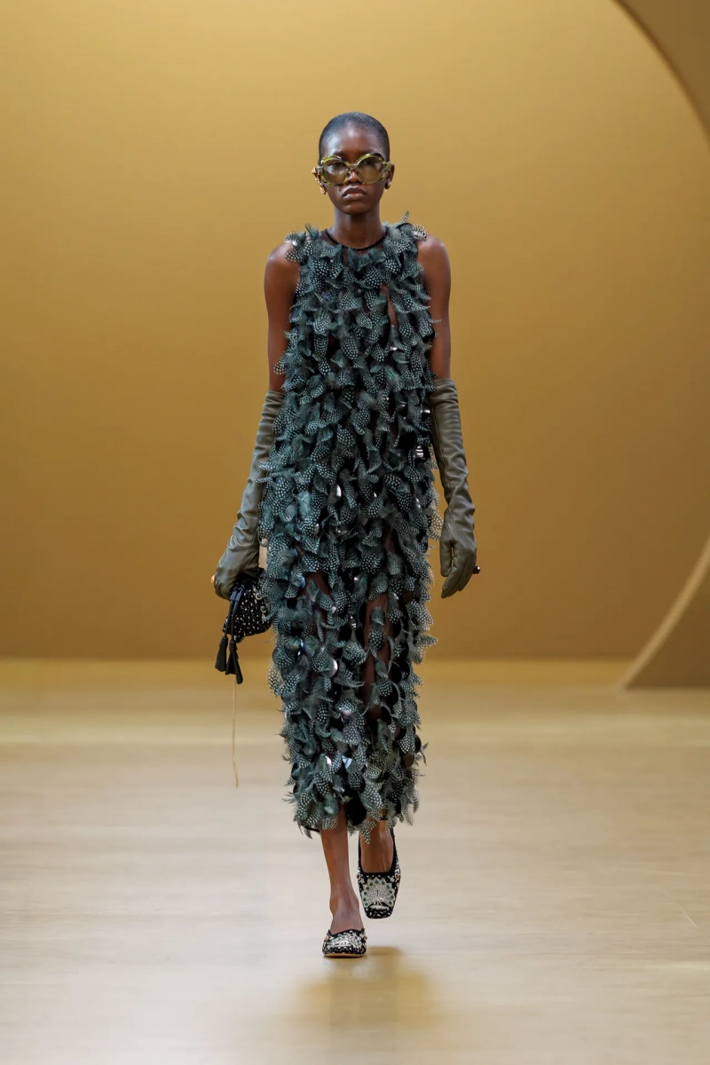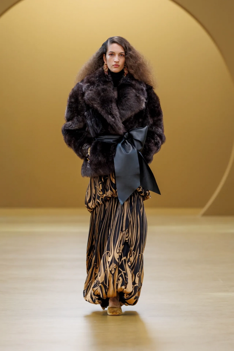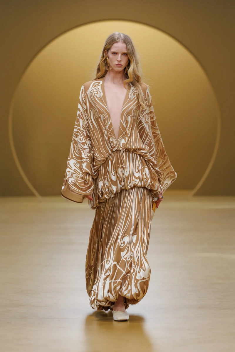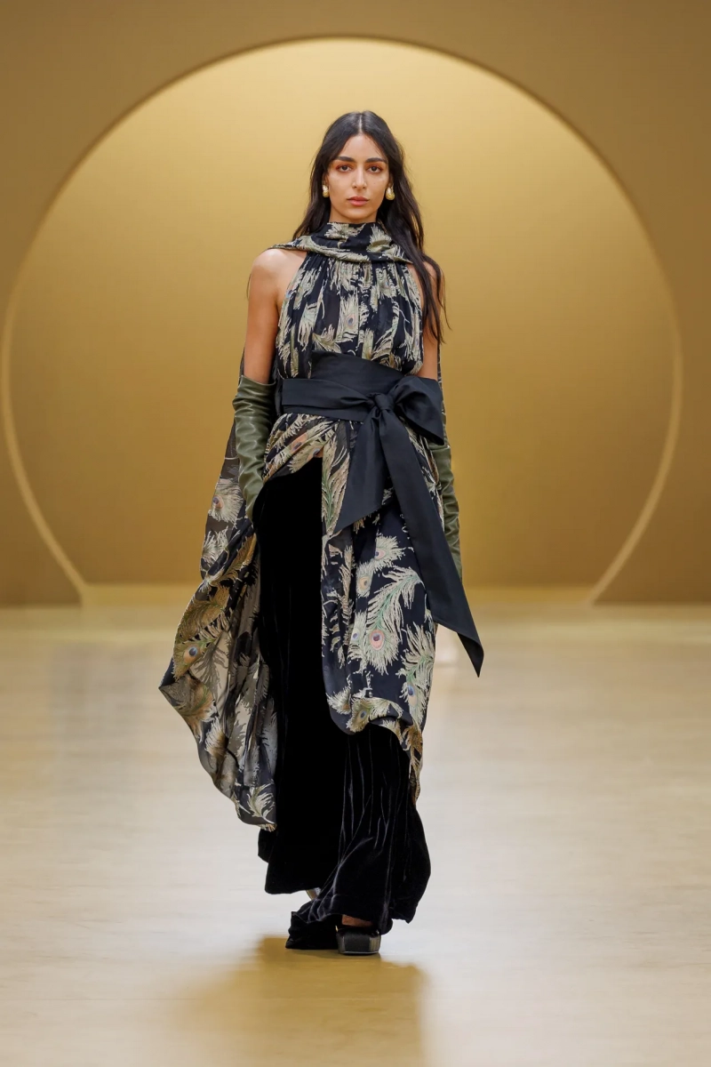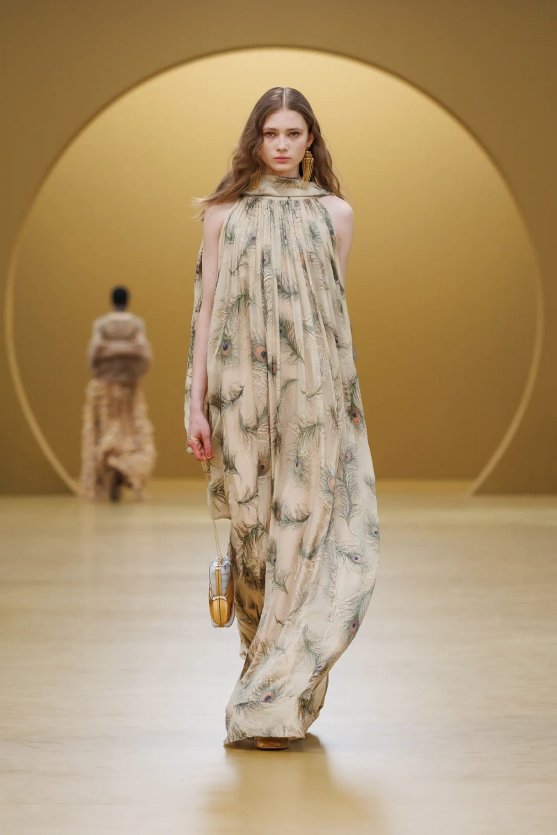Среди выдающихся принтов этого сезона были завихрения в стиле ар-нуво, выжженные на струящихся шелках, и бархатные декорированные павлиньи перья, которые закручивались по длине платья-тента.