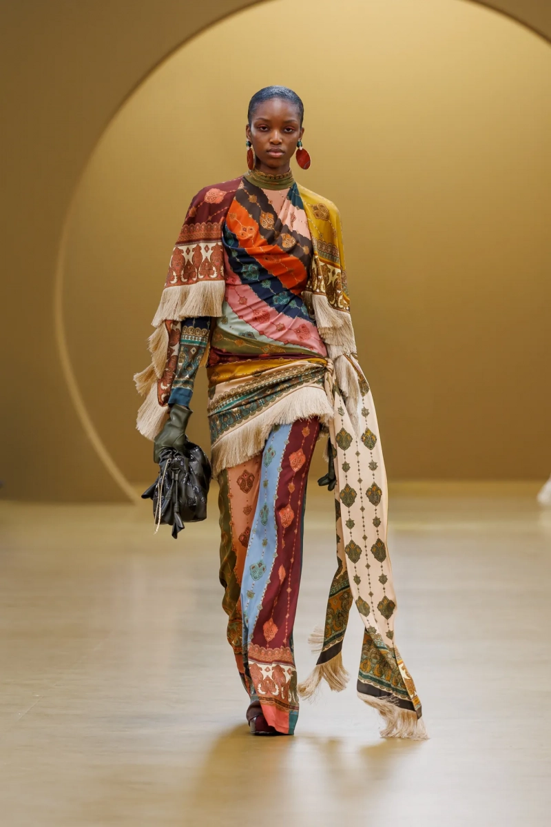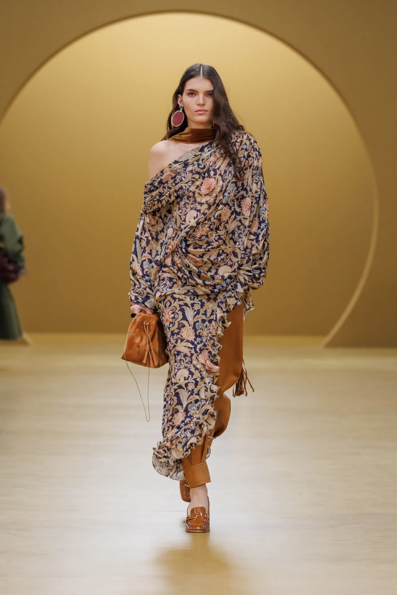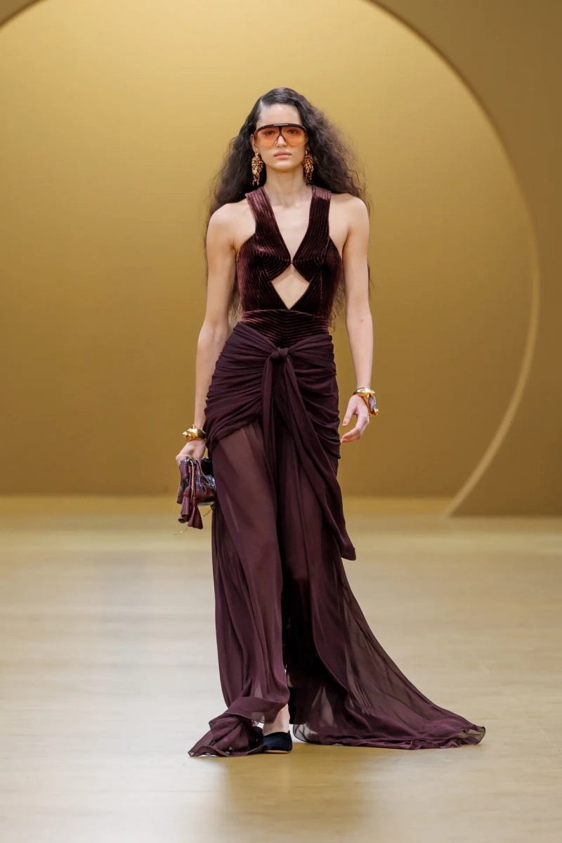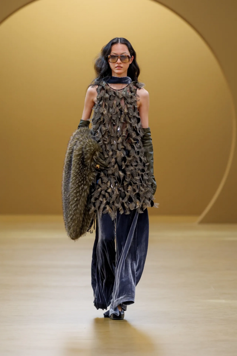 Среди выдающихся принтов этого сезона были завихрения в стиле ар-нуво, выжженные на струящихся шелках, и бархатные декорированные павлиньи перья, которые закручивались по длине платья-тента.