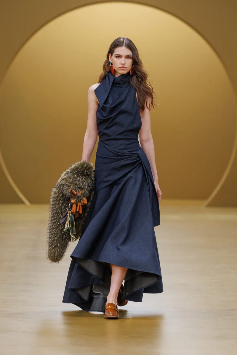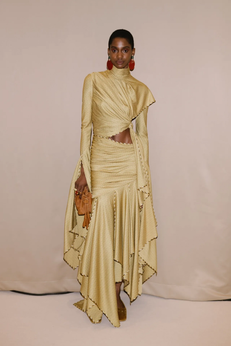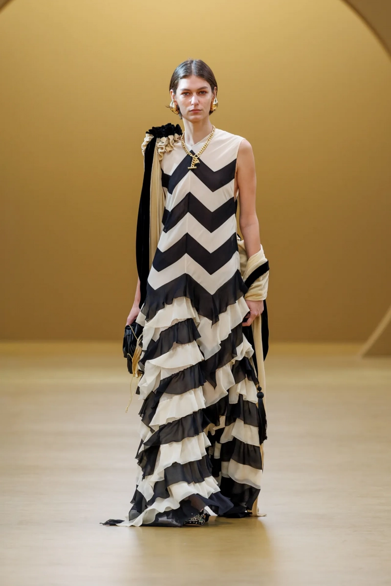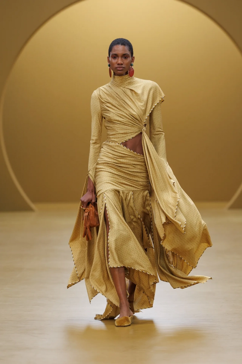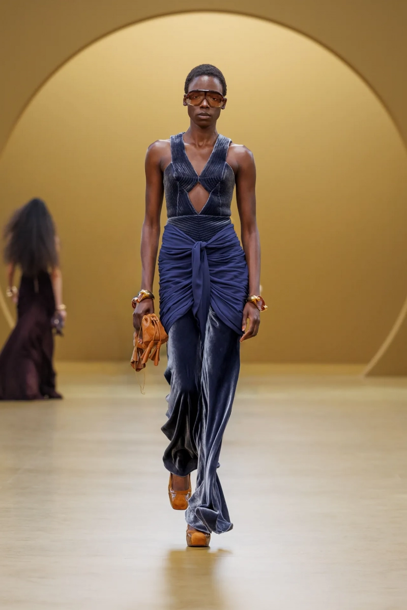 Среди выдающихся принтов этого сезона были завихрения в стиле ар-нуво, выжженные на струящихся шелках, и бархатные декорированные павлиньи перья, которые закручивались по длине платья-тента.