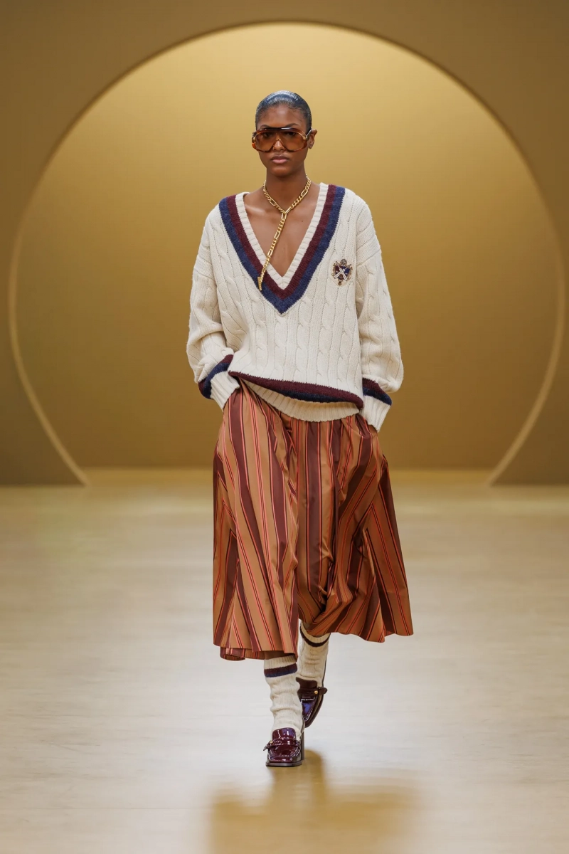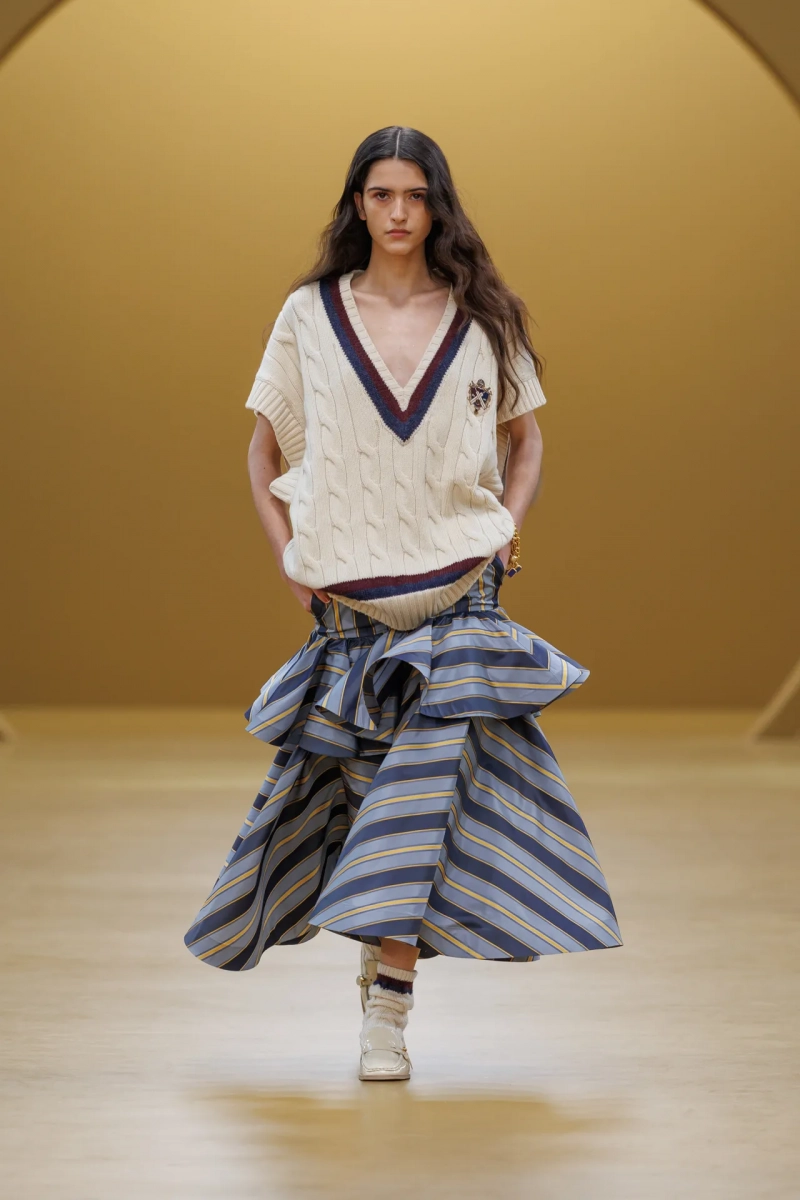 Этот бесстрашный дух отразился в коллекции, которая сочетала фирменные рябиные платья бренда с потрясающим ассортиментом дневных нарядов: от комбинезонов с поясом из плотного хлопкового сатина или мягкой кожи, до курток в стиле авиатор, драпированных джинсовых штанов и вариации Zimmermann на тему крикетной формы: свитер оверсайз с косами в сочетании с легкими полосатыми кюлотами.