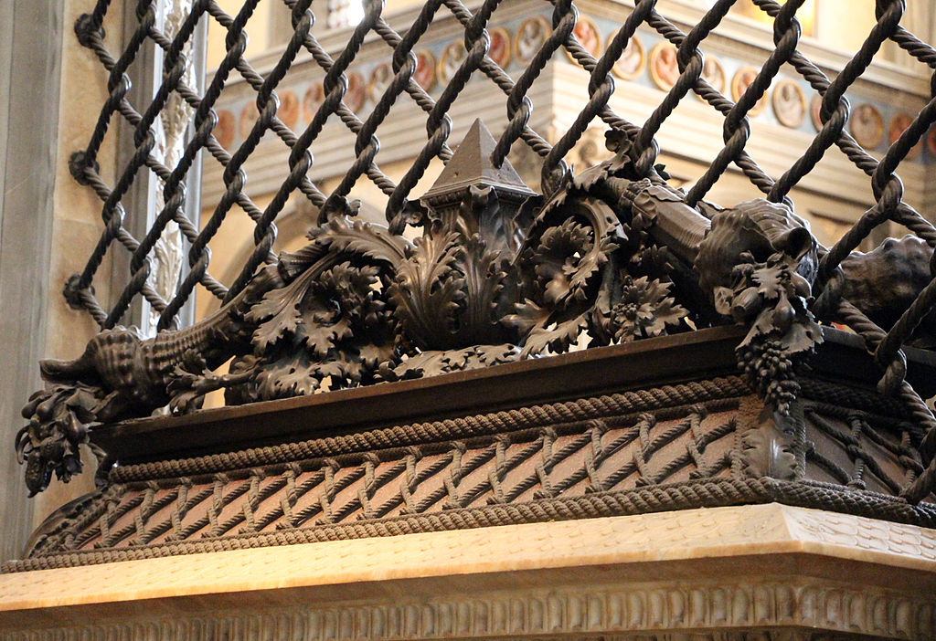 В этой работе Верроккио очень пригодились те навыки, которые он приобрел в мастерской ювелира, и в частности умение соединять разные материалы по цвету и фактуре. Полихромная композиция гробницы чрезвычайно декоративна, но при этом не нарушает торжественности интерьера церкви.