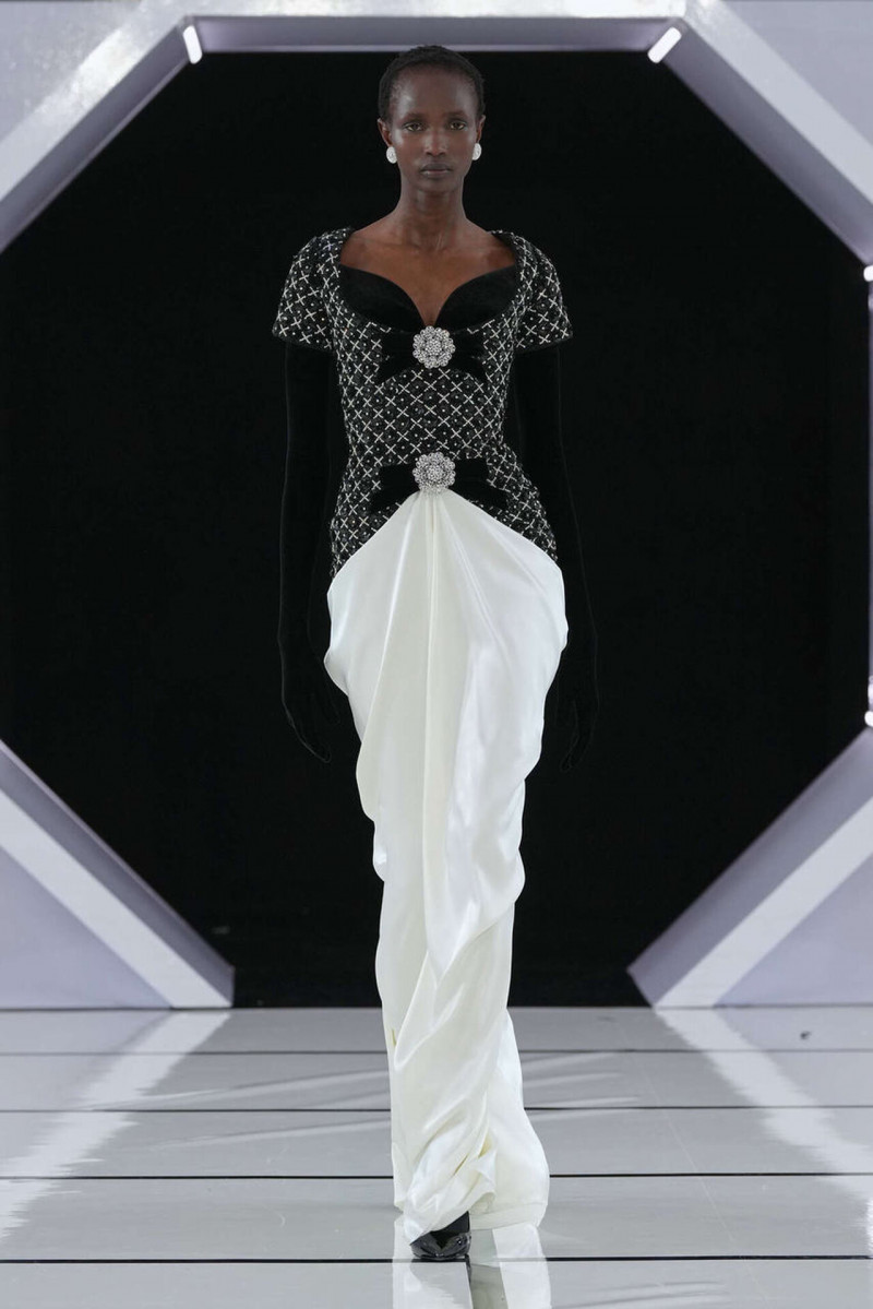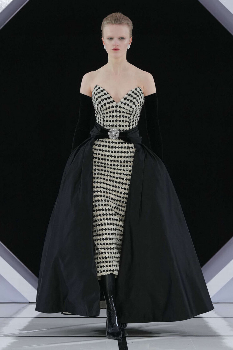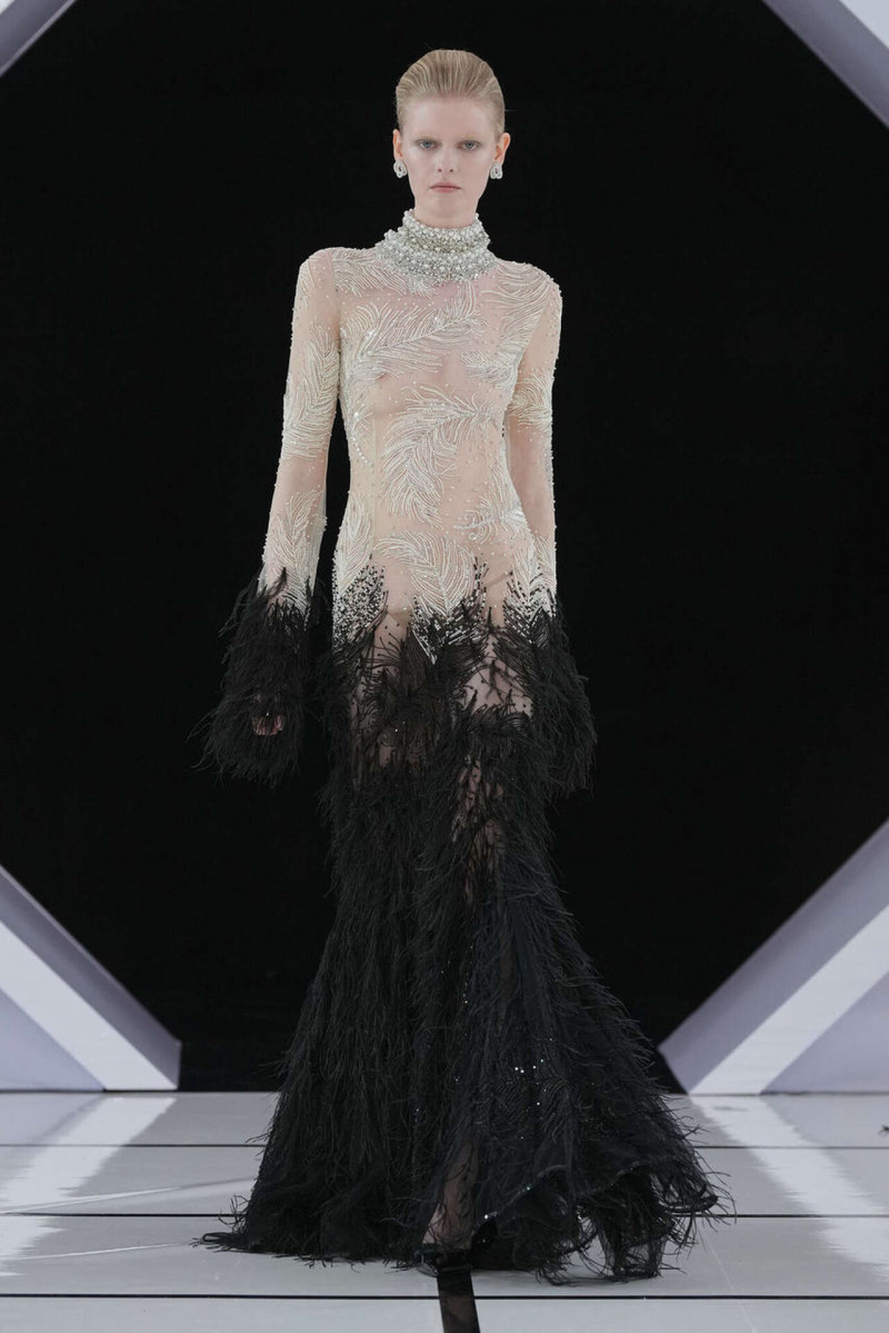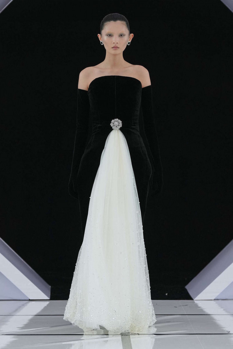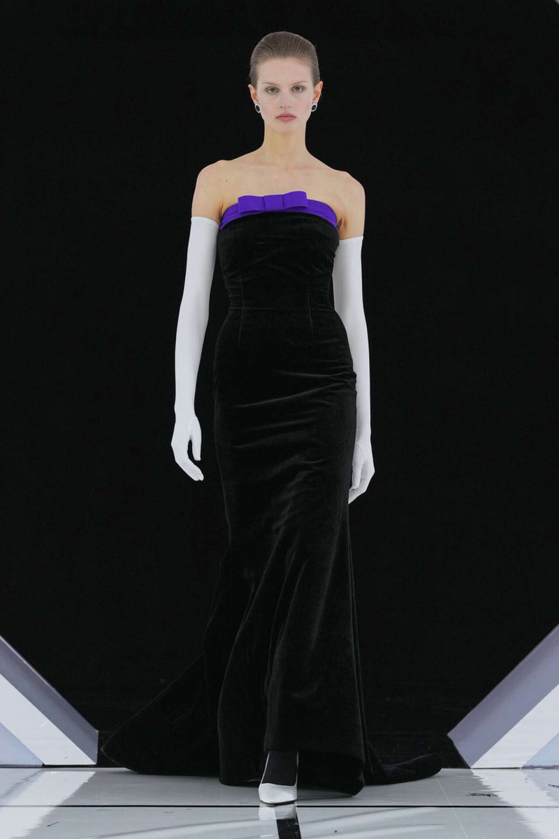 Размещенные в элегантном, футуристическом выставочном пространстве, каждый образ нес в себе присутствие сохраненного артефакта, перенесенного в будущее. Его словарь, вдохновленный высокой модой, оставался неизменным, однако силуэты демонстрировали повышенную дисциплину. Объем по-прежнему был щедрым, но вырезан с точностью; драма была сведена к контролю. Эффект был меньше театрализованного излишества и больше архитектурной убежденности.