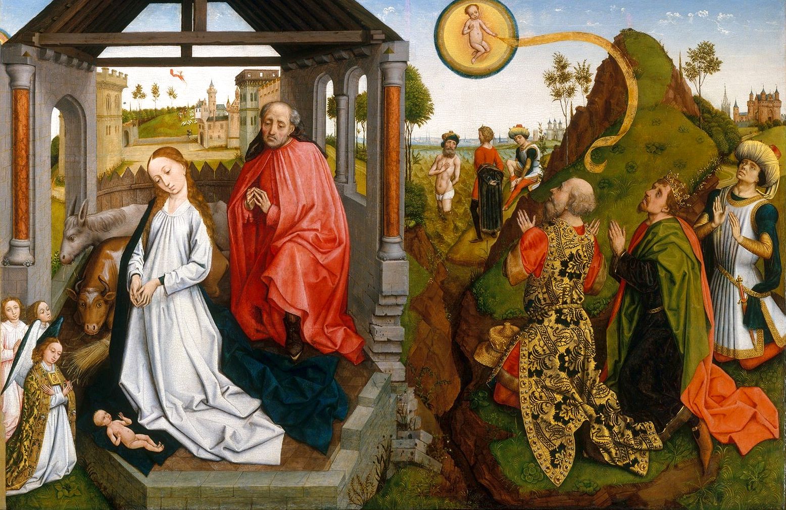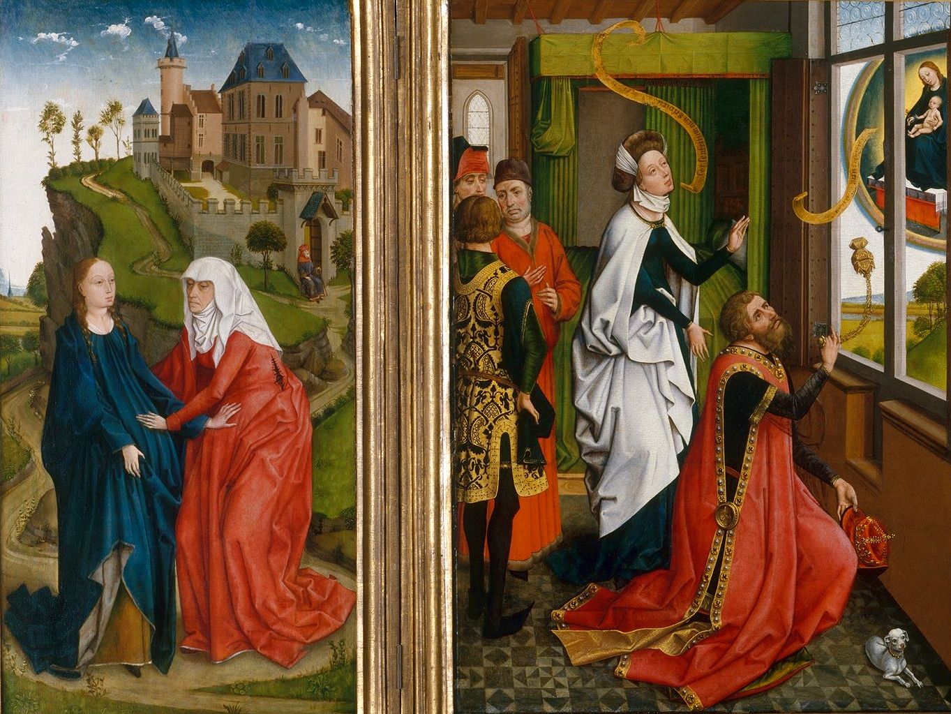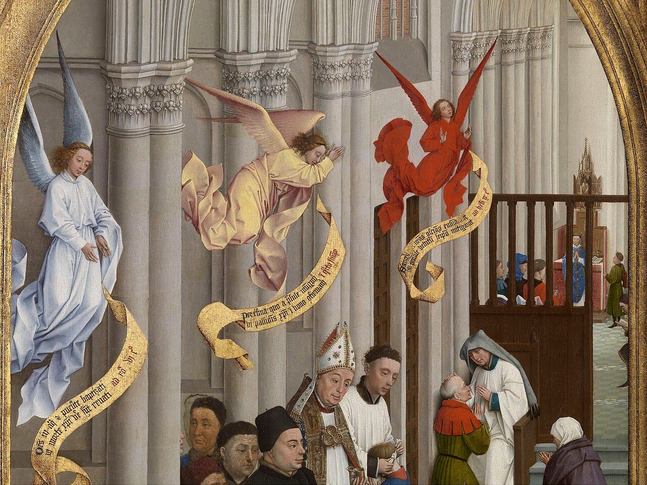 Композиция содержит серию сцен, изображающих совершение христианских таинств, в интерьере величественной церкви. Триптих был заказан советником Филиппа Доброго епископом Турне Жаном Шевро.