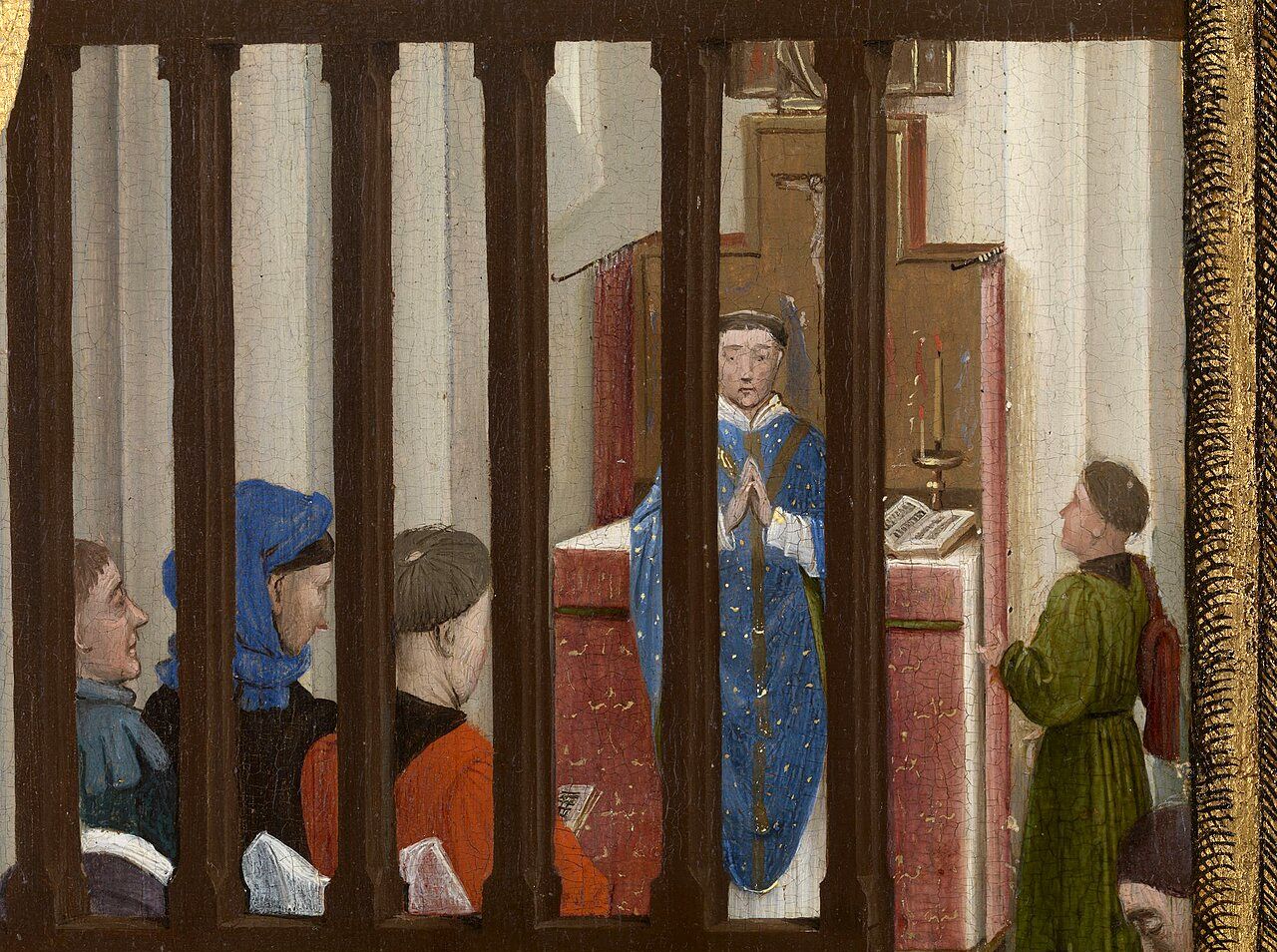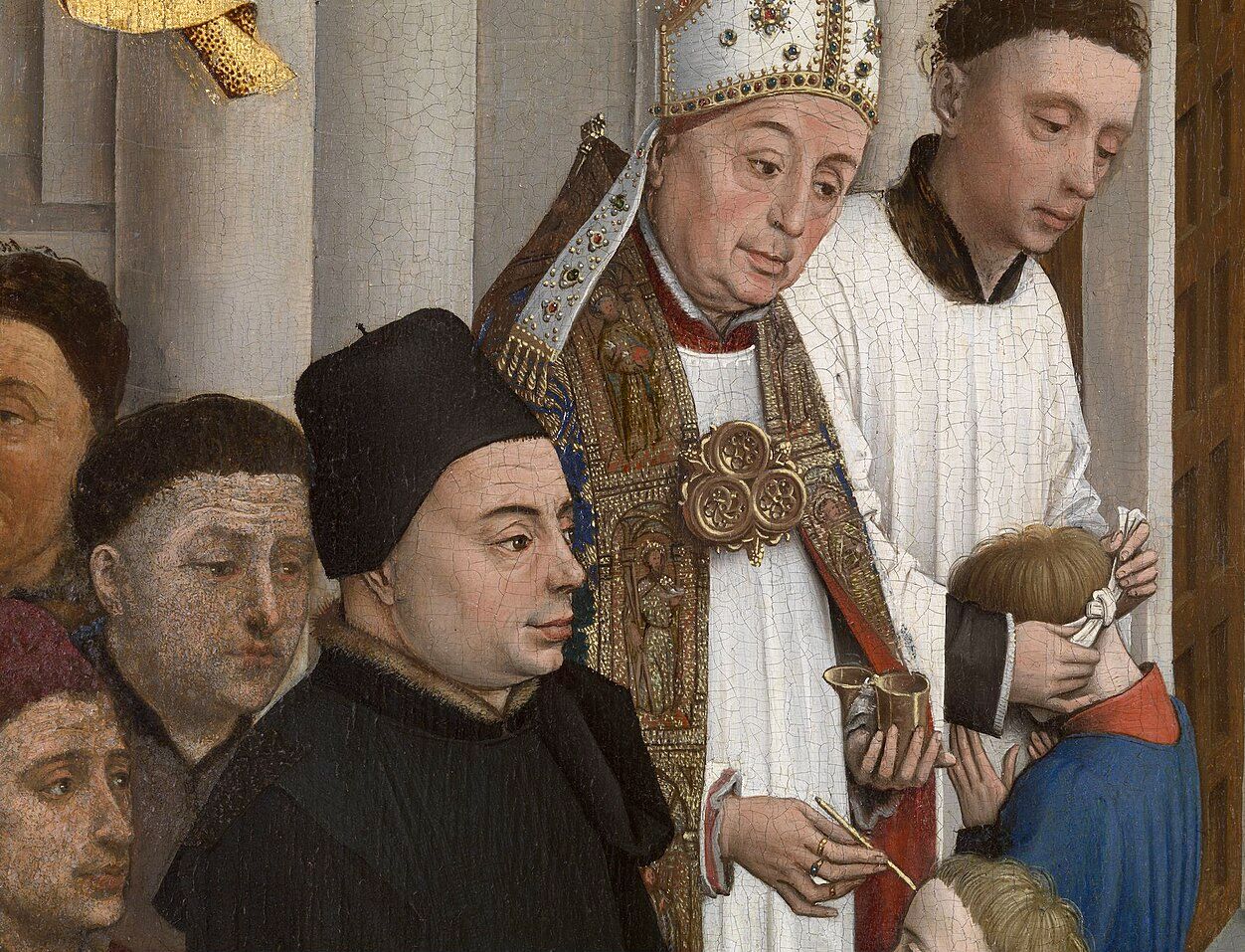 На левой створке изображены таинства (слева направо): Крещение, Миропомазание, которое совершает сам заказчик алтарной композиции епископ Турне Жан Шевро, Исповедь.