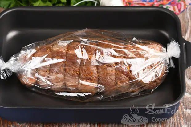 Перекладываем мясо в рукав для запекания, завязываем, протыкаем и готовим при 180 градусах 1 час. За 10 минут до приготовления, говядину раскрываем, поливаем соком со дна, увеличиваем температуру до 230 градусов и готовим еще 10 минут.