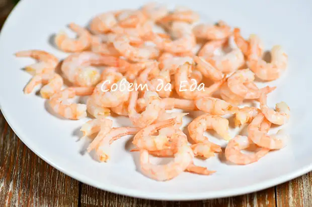 Варено-мороженные креветки небольшого размера (40 шт., у меня неочищенные) заливаем кипятком и оставляем на 5-7 минут. Очищаем. Но для ускорения процесса лучше покупать очищенные креветки.