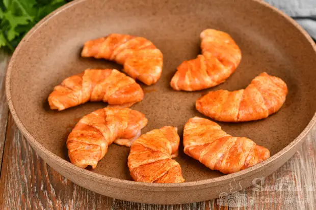 Растительное масло (1,5 ст. л.) перемешиваем со сладкой молотой паприкой (1 ч. л.) и с помощью кисти смазываем заготовки со всех сторон. Ананас в беконе по 7 шт. выкладываем швом вниз на горячую сковороду без масла.