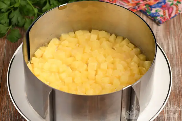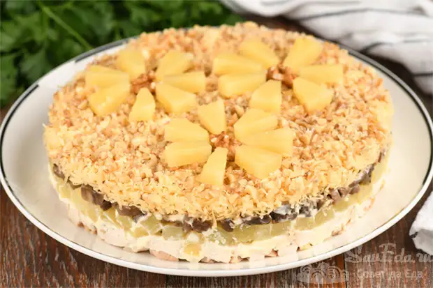 Шампиньоны (300 г) нарезаем на средние кубики и обжариваем в масле (1 ст. л.) с мелко нарезанным луком (небольшая луковица). В конце солим, перчим. Остужаем и выкладываем на ананас, добавляем немного майонеза.