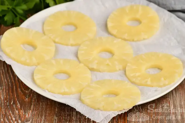 Консервированные кольца ананаса (5 шт.) выкладываем на бумажные полотенца, сверху тоже закрываем полотенцами (удаляем жидкость). Затем разрезаем каждое кольцо на 4 части (20 заготовок).