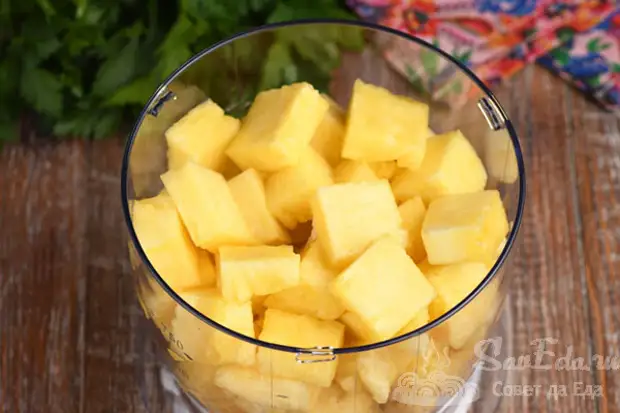 Свежий ананас очищаем, нарезаем на кубики и отправляем в чашу блендера (вес очищенного ананаса 300 г).