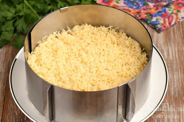 Полутвердый сыр (100 г) измельчаем на мелкой терке и посыпаем грибы. Сыр не прижимаем, он сделает салат воздушным, нежным и добавит приятный сливочный вкус. Наносим на сыр немного майонеза.