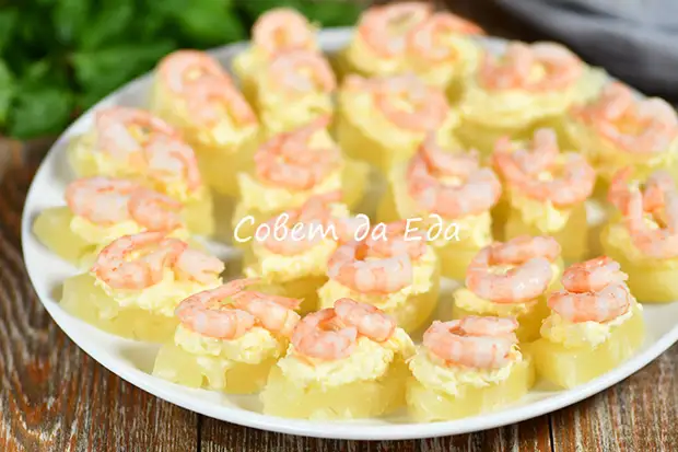 Собираем закуску. На четвертинки ананаса добавляем сырную смесь, сверху креветки (по 2 шт.).