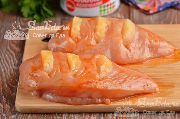Кольца консервированного ананаса (3 шт.) разрезем пополам. Филе солим со всех сторон, поливаем маслом (по 1 ч. л.), посыпаем паприкой (по 1 щепотки) и распределяем. Паприка сделает белое мясо более ярким. Размещаем ломтики ананаса в разрезах.