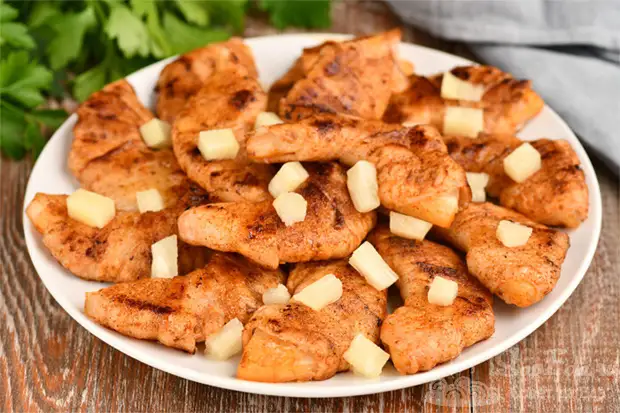 5. Куриное филе, запеченное с ананасом. Филе куриной грудки промываем, просушиваем бумажными полотенцами и удаляем малое филе (общий вес кусков около 450 г). Переворачиваем филе вверх стороной, на которой была кожа, и делаем острым ножом 3 довольно глубоких поперечных разреза.
