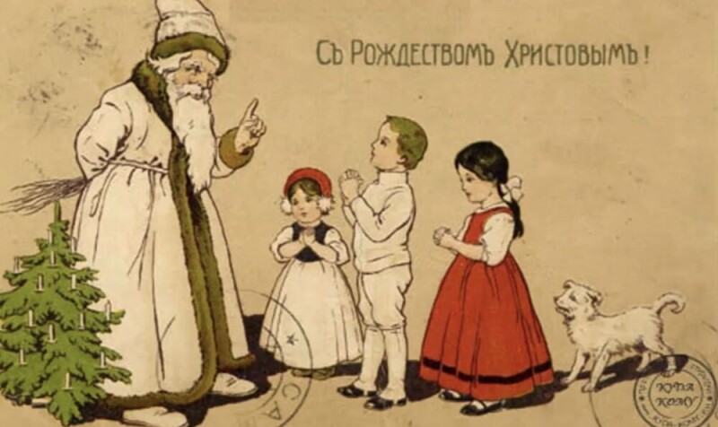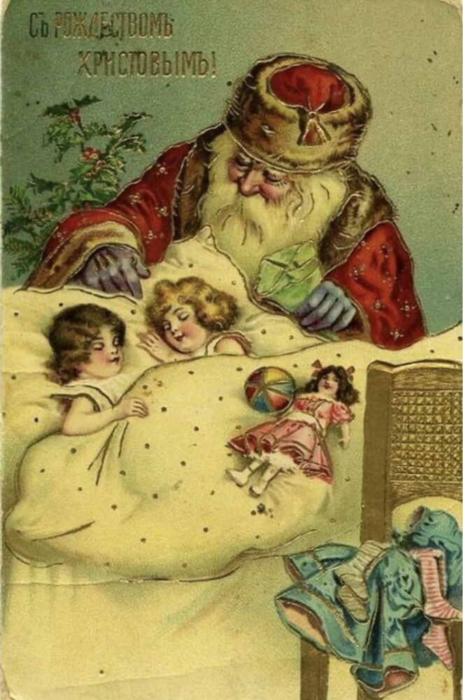 И, кстати, заметьте, внешний облик Деда Мороза еще не похож на нынешний, но и от Санта-Клауса отличается.