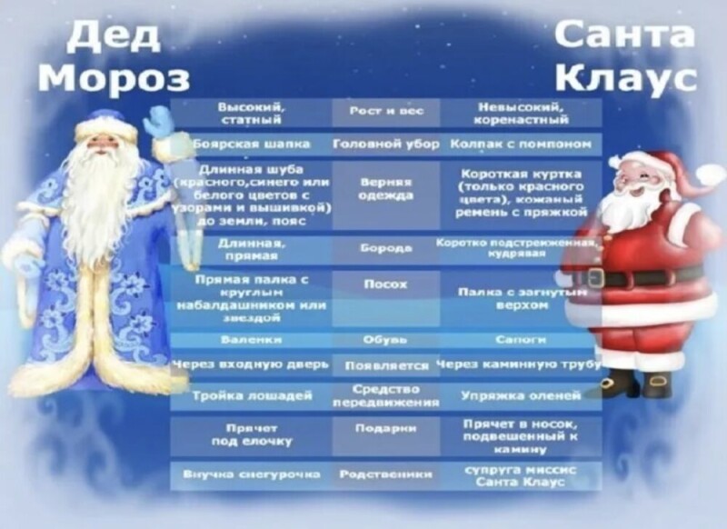 Основные отличия Деда Мороза от его самого известного брата Санта Клауса приведу для наглядности в таблице: