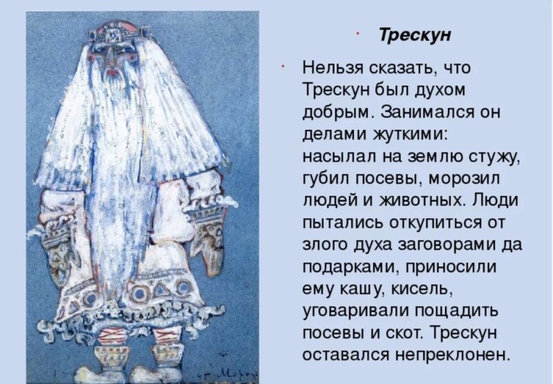 Он отвечал за сильные и трескучие морозы, именно он заставлял скрипеть снег под ногами, трещать от мороза деревья и лед на реках.