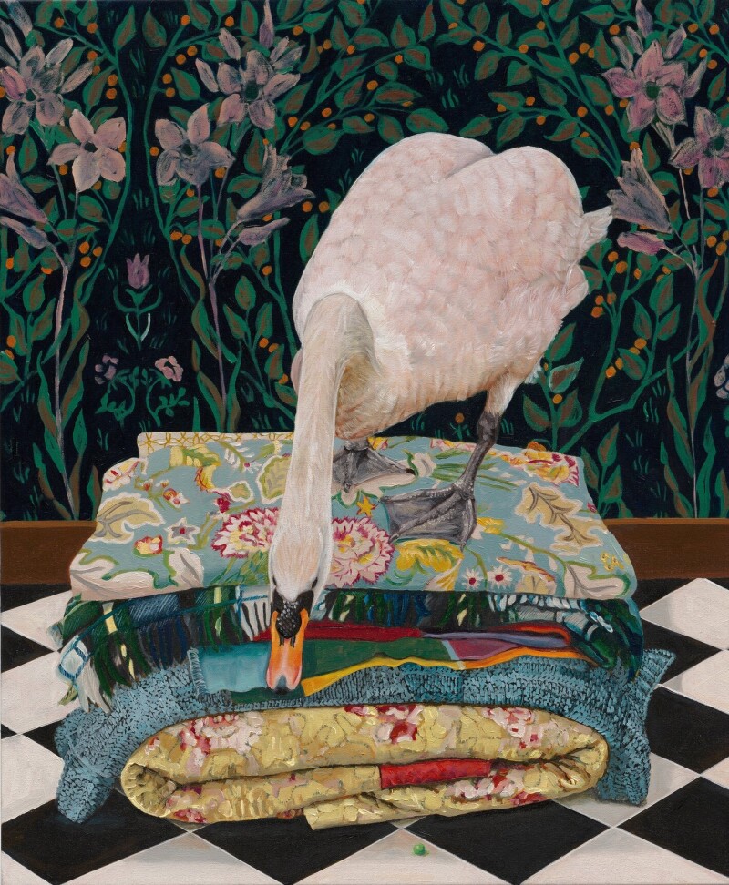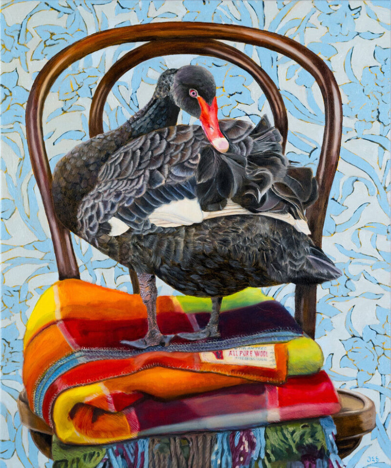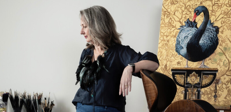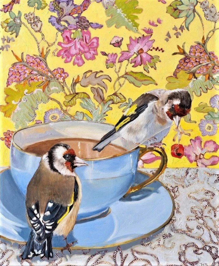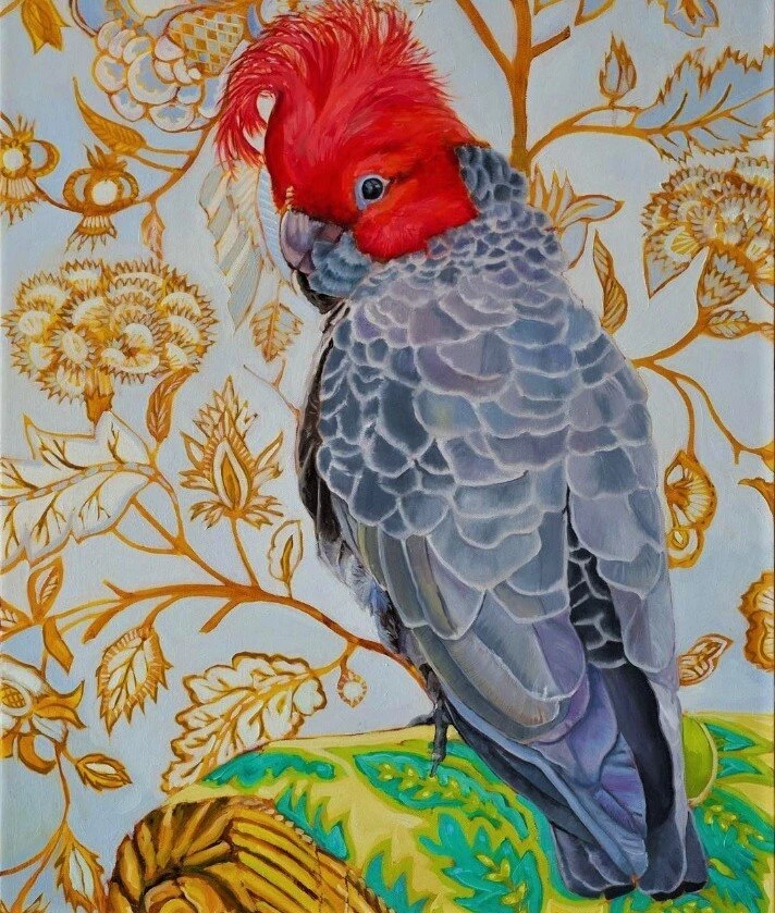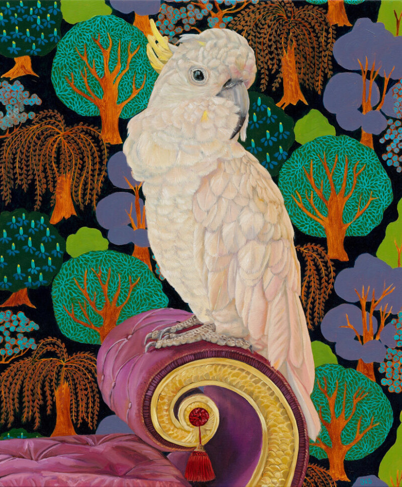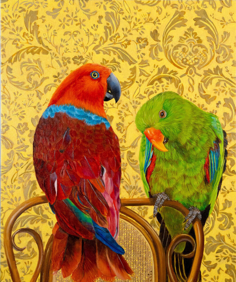 Эти картины с птицами - последняя серия работ художницы. Она посвящена нашим птичьим товарищам, сопровождающим жизнь человека на протяжении уже многих веков. На ее полотнах птицы часто представлены крупным планом на фоне узорчатого фона элегантных обоев и тканей эпохи якобинцев или стиля Людовика XV.