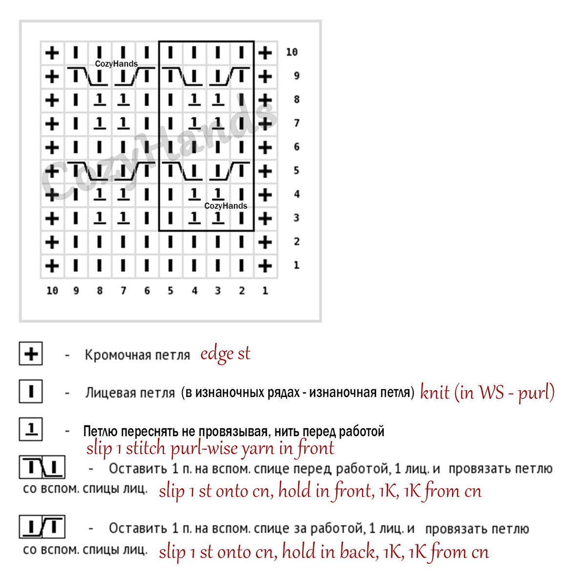 9 ряд: кром.п., * 1 петлю снять на вспомогательную спицу перед работой, 1 лиц.п., петлю со вспомогательной спицы провязать лиц.п.; петлю снять на вспомогательную спицу за работой, 1 лиц.п., петлю со вспомогательной спицы провязать лиц.п.,* кром.п.