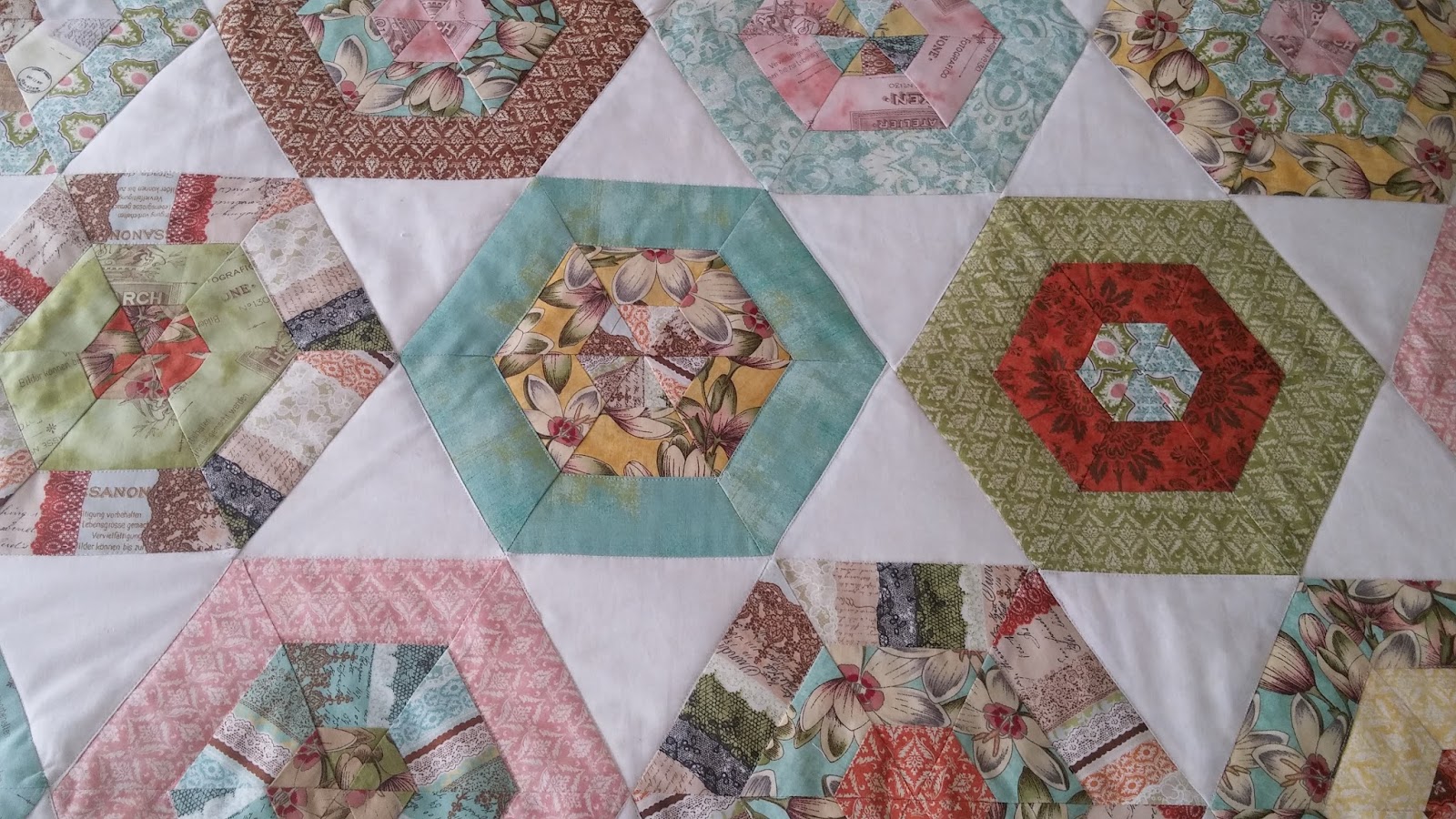 69 полос 2.5*42 разложены по цвету. Потом их сшивают по 3 = 23 трехцветные полосы. Из каждой полосы выкраиваются 12 треугольников = 2 шестиугольникам. Из 23 полос выходит 46 шестиугольников.