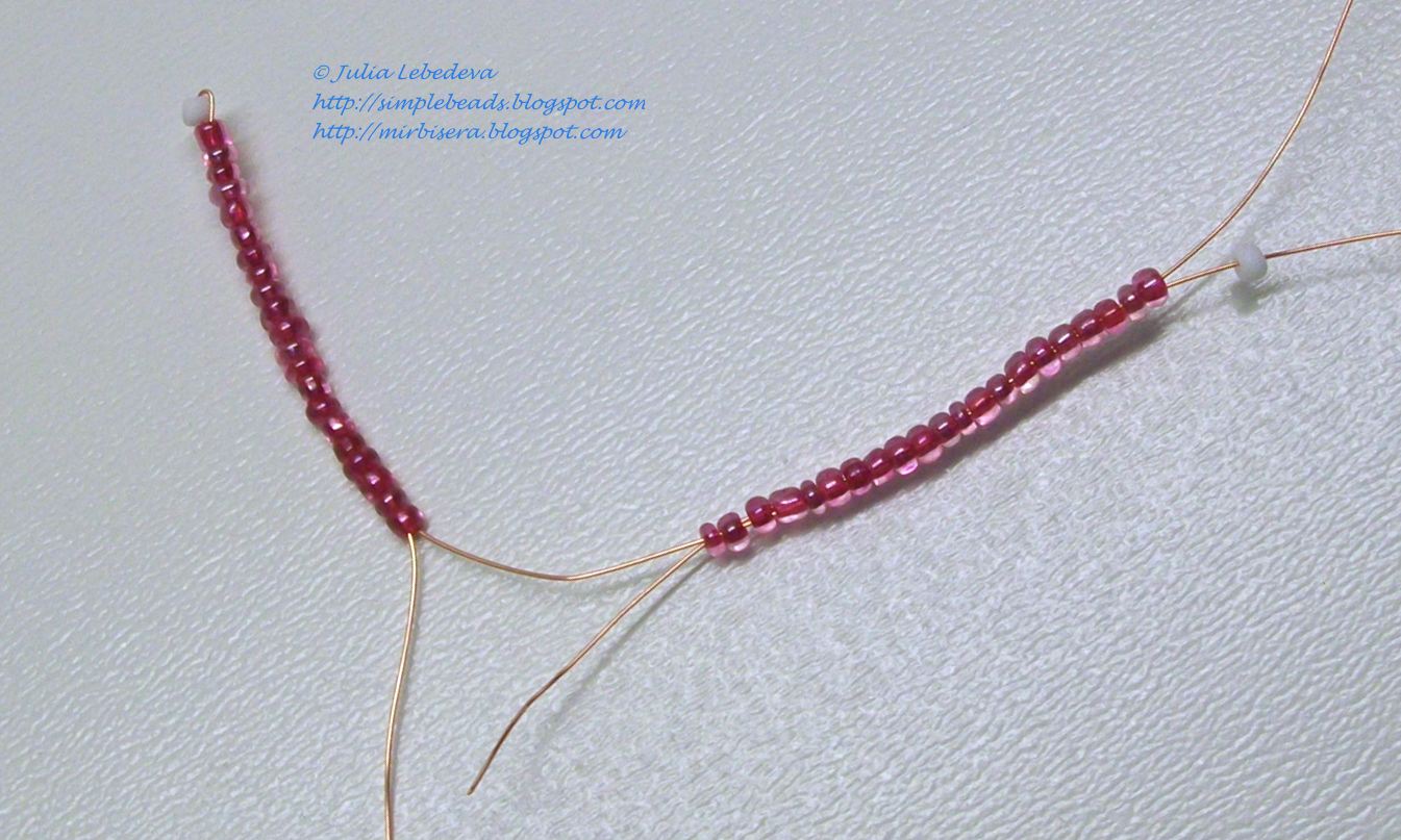 Придерживаем рукой белую бисеринку и пропускаем выходящий из неё длинный конец проволоки через все остальные бисеринки в обратном направлении.