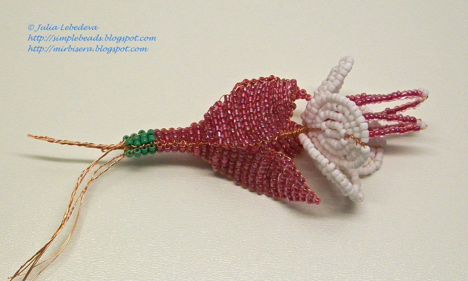 и далее продолжаем доплетать ряды на втором лепестке по той же схеме, по которой мы плели первый лепесток, только перед каждым новым рядом приплетаем проволоку от второго лепестка к первому лепестку. Поскольку количество бисеринок в соответствующем ряду во всех лепестках одинаковое, завершая второй лепесток, набираем следующее количество бисеринок: