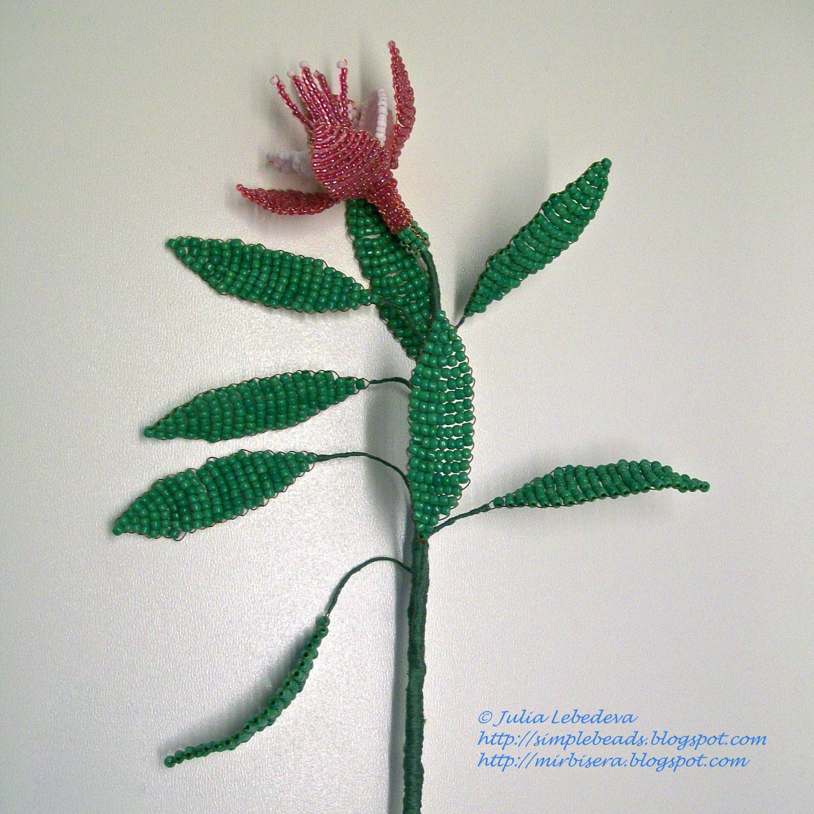 Чтобы получился куст фуксии, надо сделать несколько таких веточек. Я сделала три веточки и поставила их в подходящий горшочек.Фуксия из бисера готова!