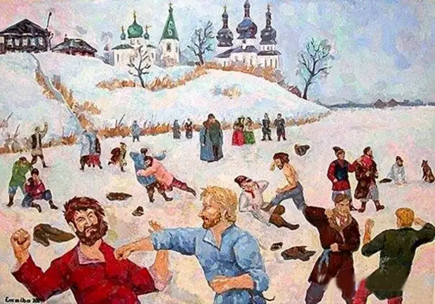 Еще одно развлечение — кулачные бои. Это развлечение считалось одной из главных традиций четвертого дня Масленичной недели, особенно среди молодых парней и мужчин. Для этого они собирались у реки, где устраивали бои один на один, или «стенка на стенку». Чтобы забава таковой и оставалась, были свои запреты — не бить ниже пояса и по затылку.