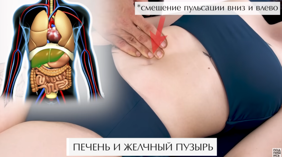 Если мы говорим про смещение сердцебиения и биение аорты вниз и влево, то его чаще всего вызывают проблемы с печенью и желчным пузырём. Правая верхняя доля "утягивает" кишечник на себя, и если пупок смещён вниз и влево, то это наверняка говорит о проблемах с печенью и желчным пузырём.