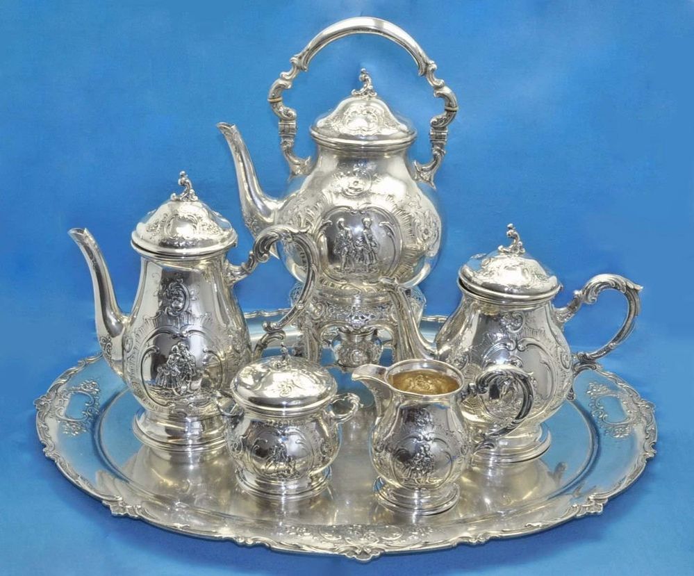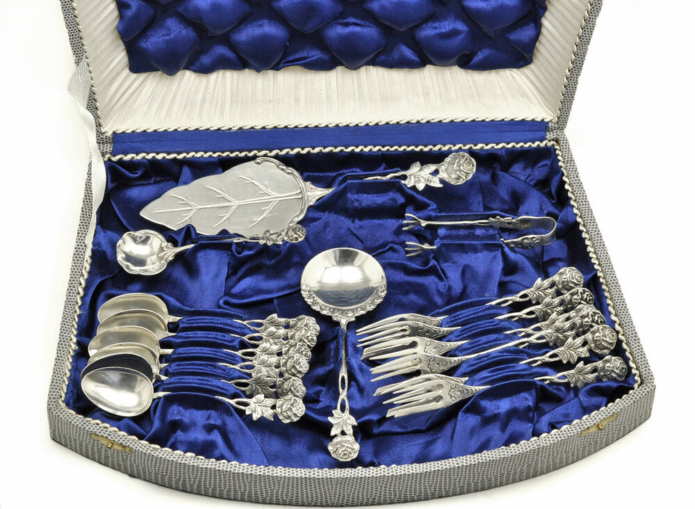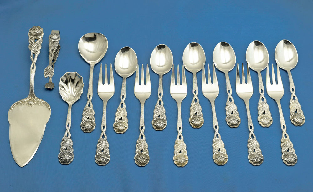 На фото ниже изображен набор из 16 предметов в стиле «Роза Хильдесхайма» из серебра 800 пробы.