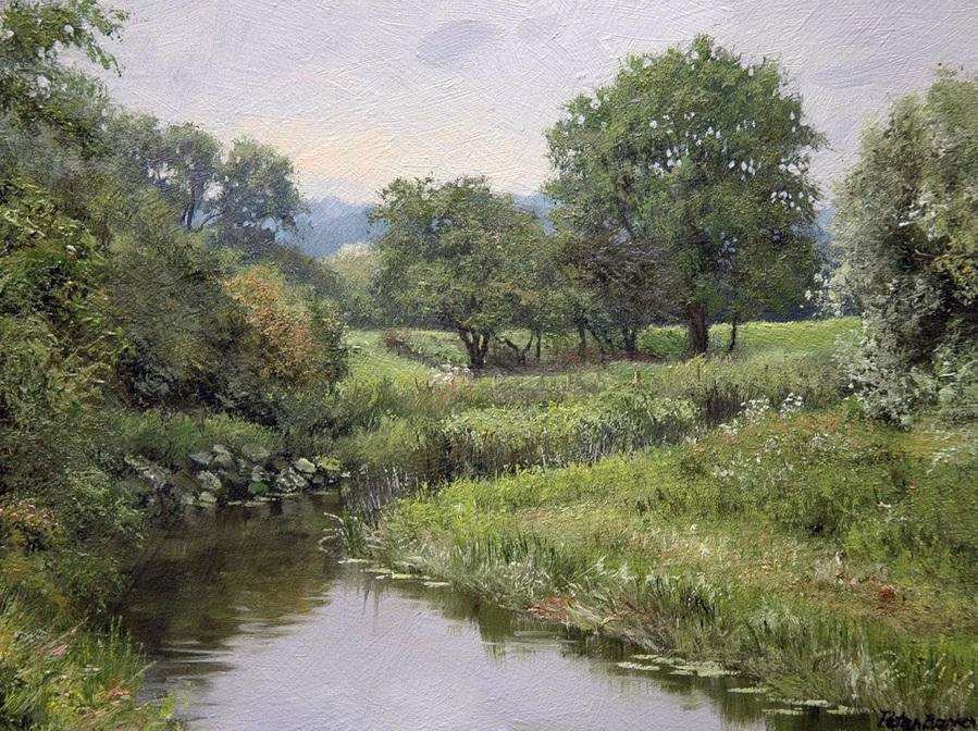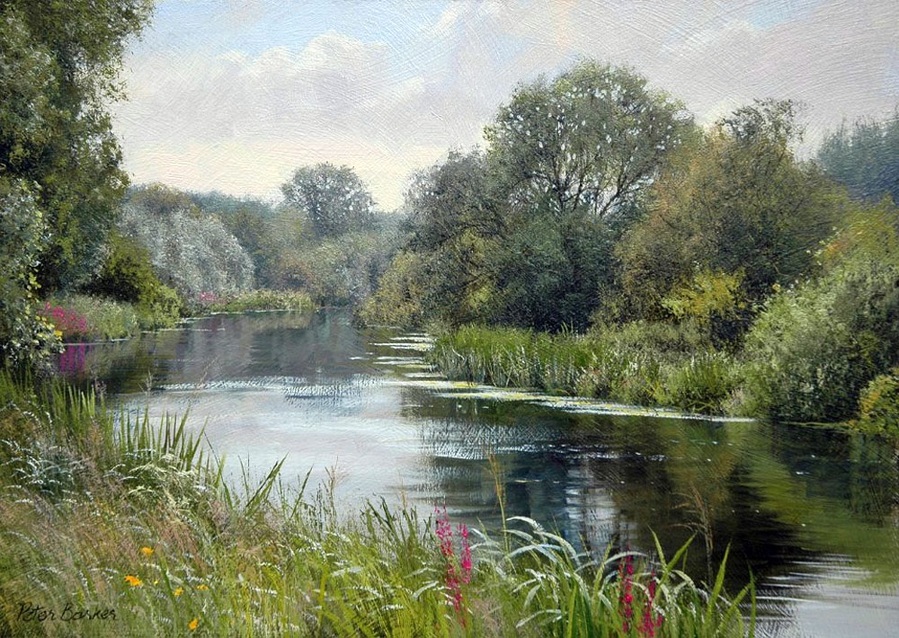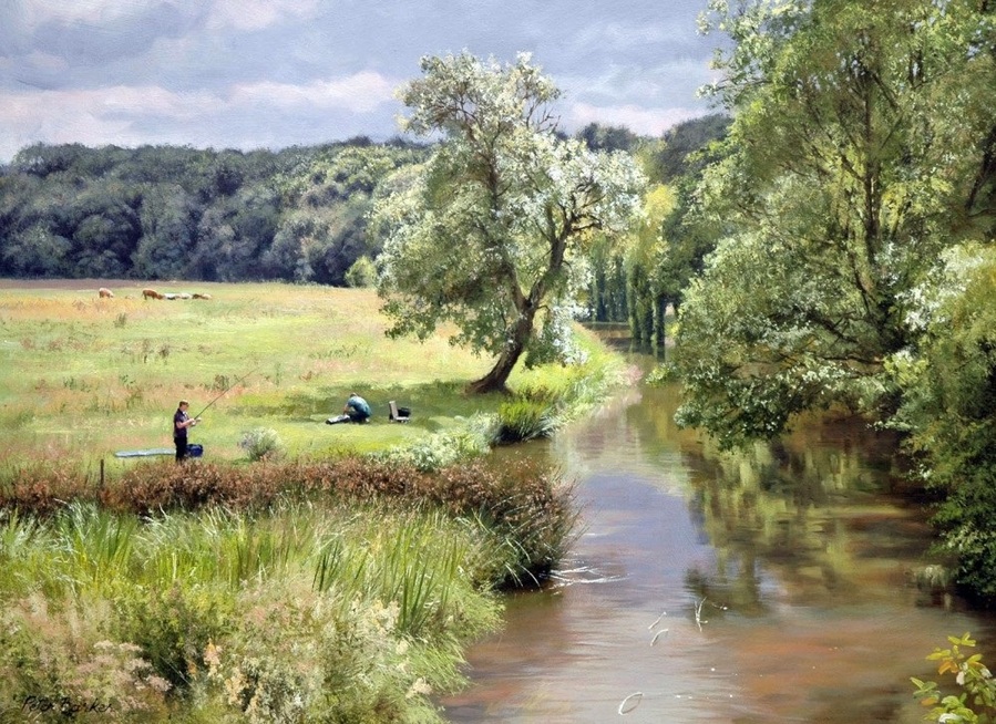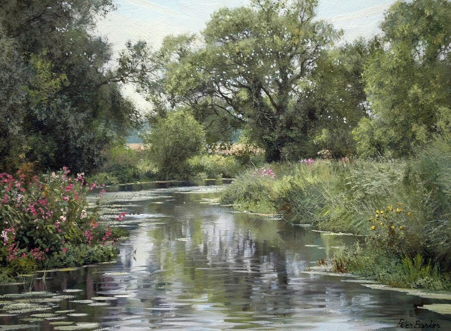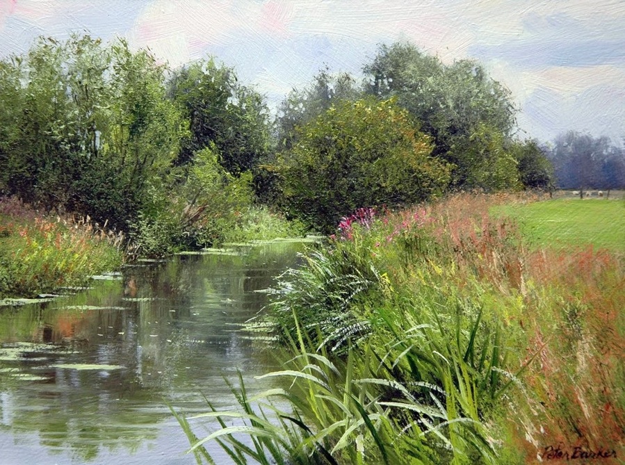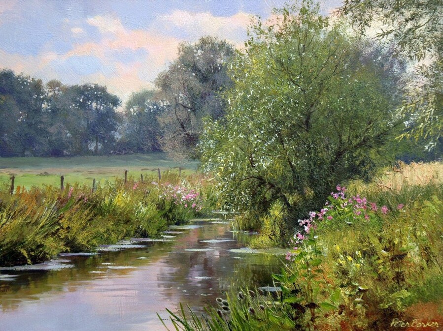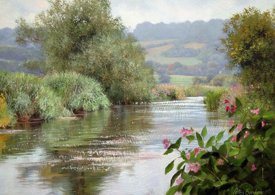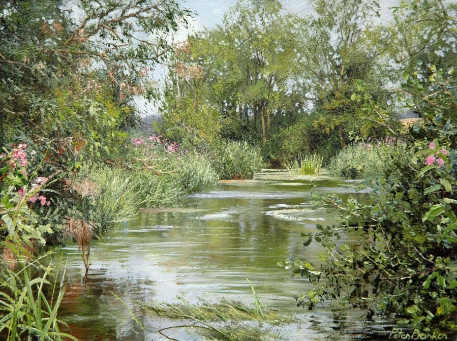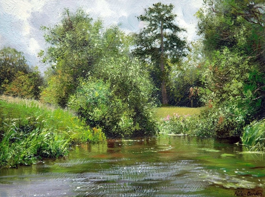 Питер пишет в основном маслом, а иногда пастелью и акварелью, и особенно известен своим реалистичным изображением воды и умение создавать поразительные изображения листвы и растительности деревьев с помощью 1-дюймовой кисти декоратора для сада и огорода.