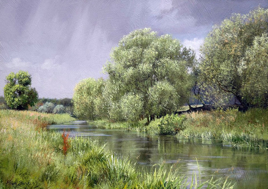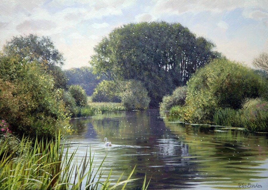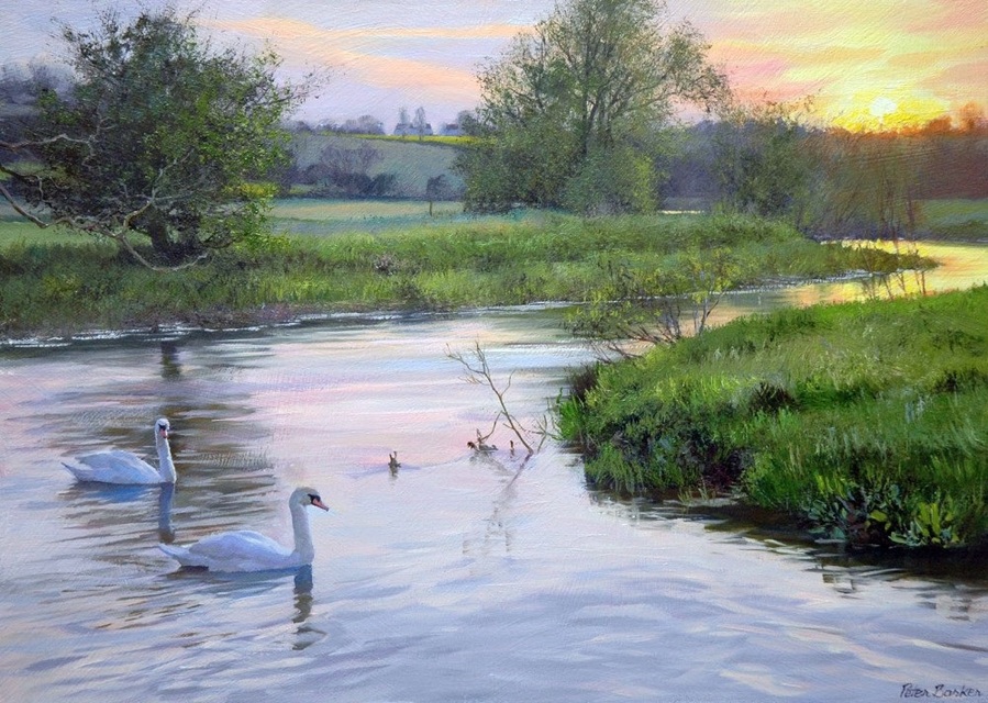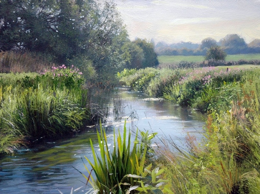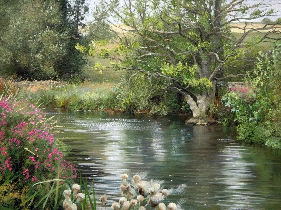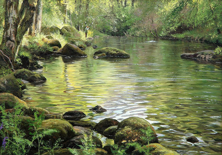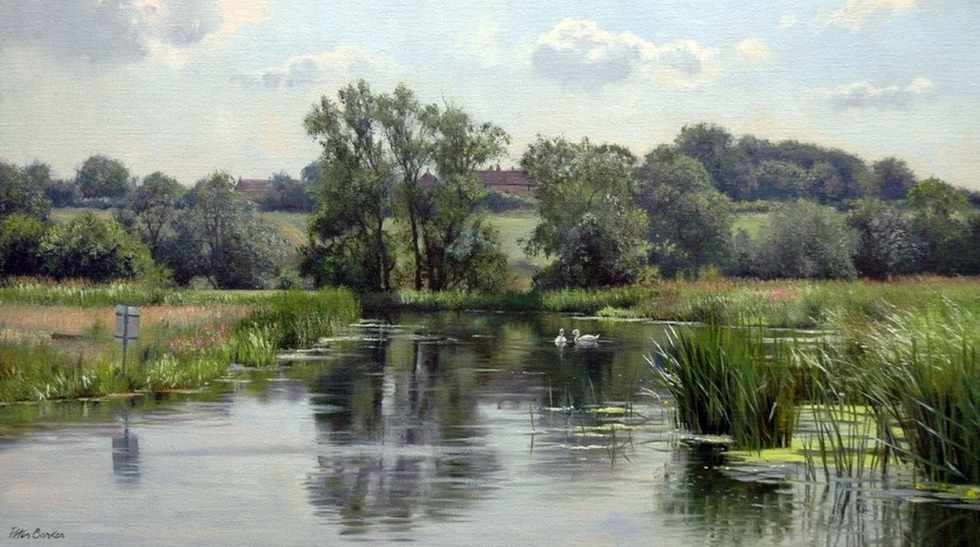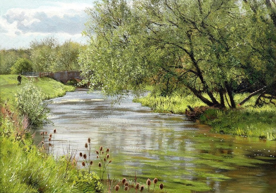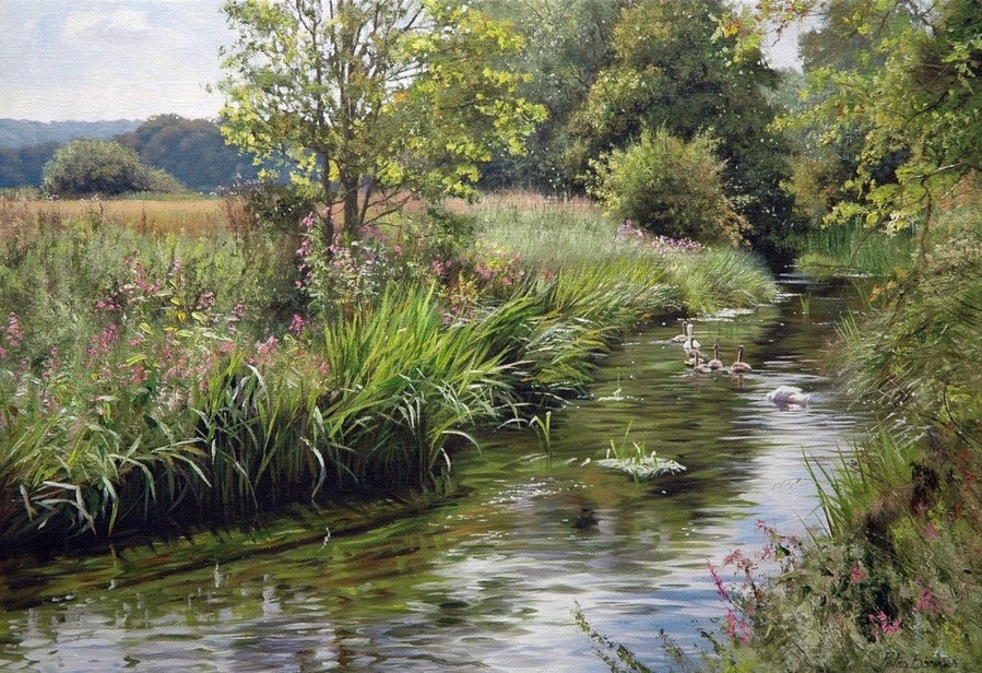 Питер пишет в основном маслом, а иногда пастелью и акварелью, и особенно известен своим реалистичным изображением воды и умение создавать поразительные изображения листвы и растительности деревьев с помощью 1-дюймовой кисти декоратора для сада и огорода.