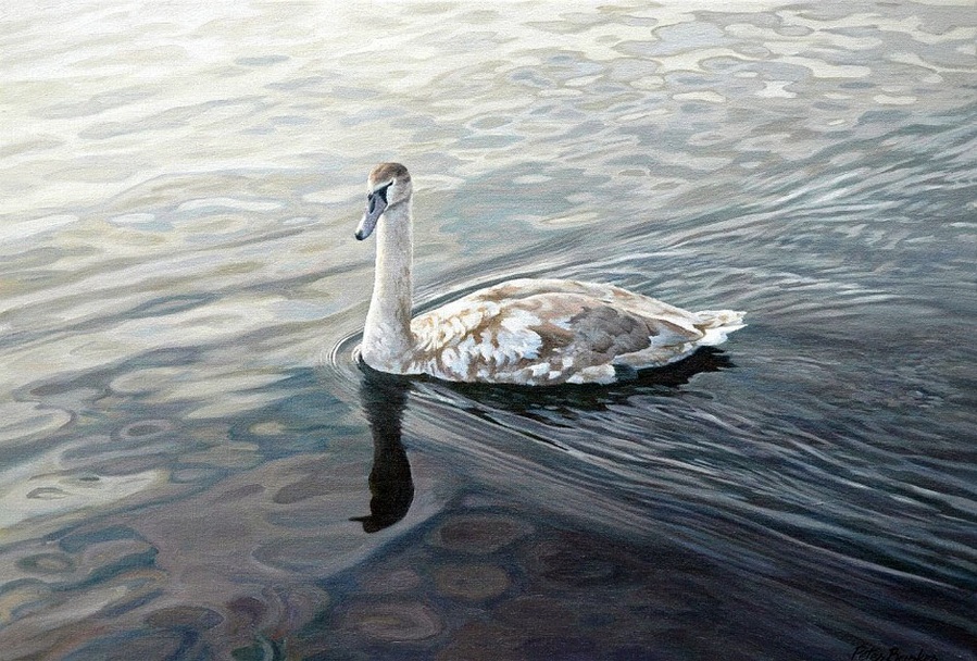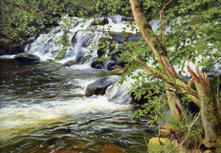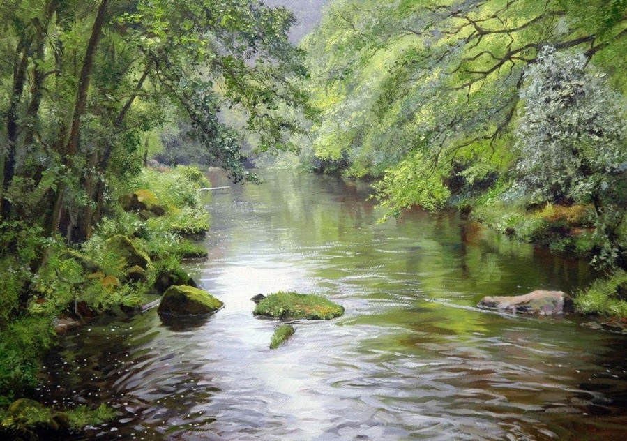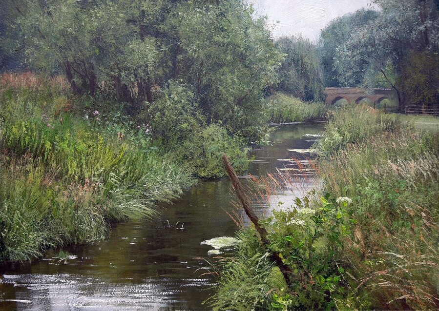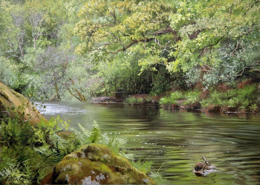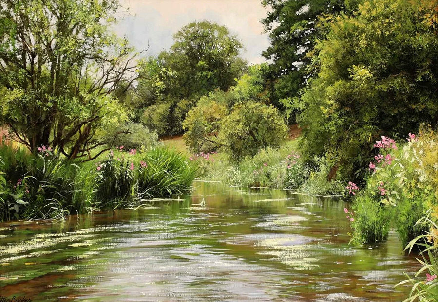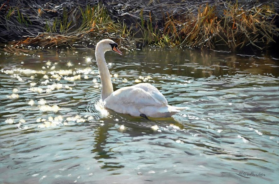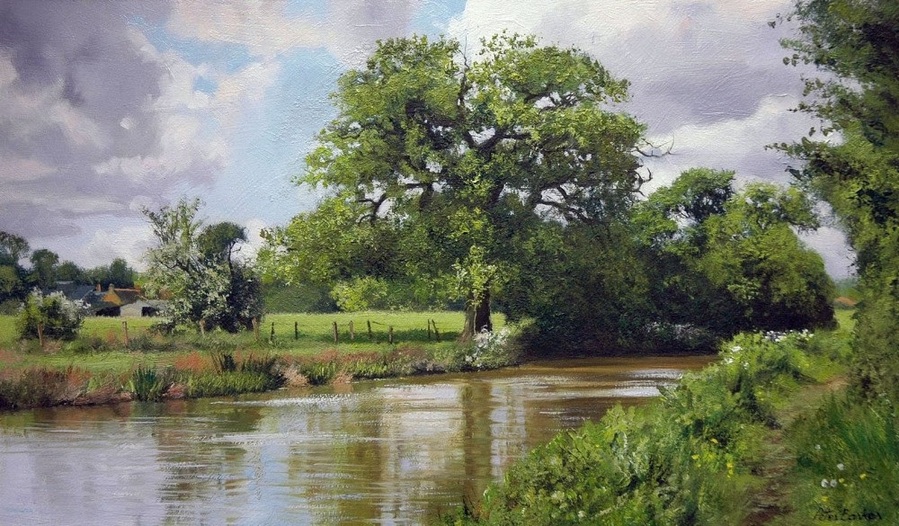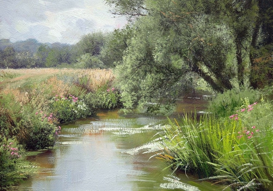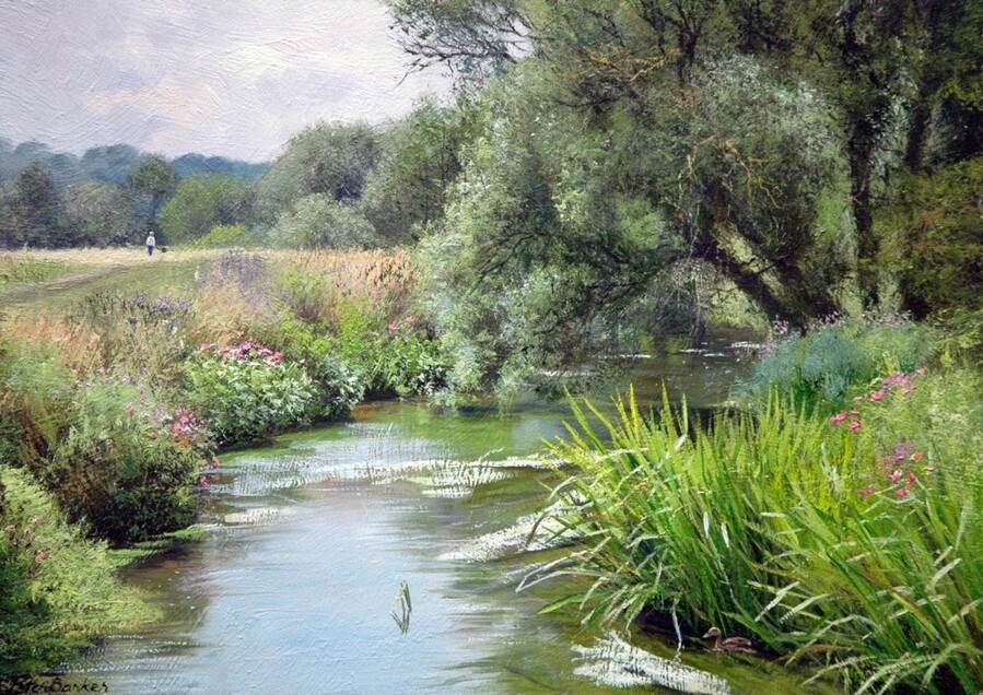 Питер пишет в основном маслом, а иногда пастелью и акварелью, и особенно известен своим реалистичным изображением воды и умение создавать поразительные изображения листвы и растительности деревьев с помощью 1-дюймовой кисти декоратора для сада и огорода.