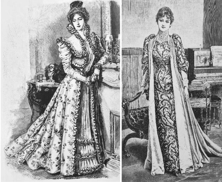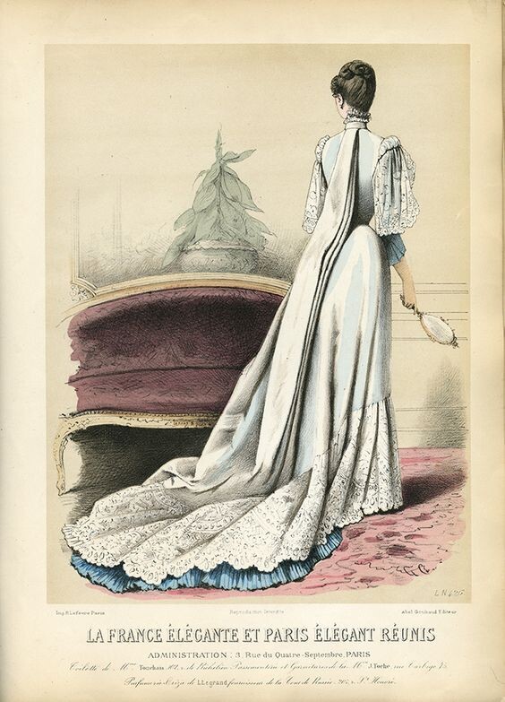 В «Хорошем тоне. Сборнике правил и советов на все случаи жизни общественной и семейной» 1881 года можно прочесть следующее: «На маленький вечер или чай дамы одевают бархатные или шелковые платья, со шлейфом, воротничок и рукавчики кружевные или crêpe lisse', но никак не полотняные. Если дама молодая, то платье может быть спереди вырезано. Молодые девушки могут употребить для своего наряда платье из легкого шелка, поплина, даже светлого кашемира и ворот платья, вырезанный carré en coeur; рукава до локтя, цветок в волосы, перчатки, подходящие к платью, но светлее. На обыкновенный чай одеваются гораздо проще, - девушки в шерстяных платьях и без цветов. Дамы и немолодые уже девушки одевают шелковые».