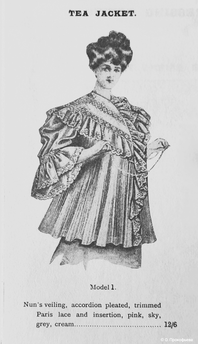 Интересно, что в конце XIX — начале XX века помимо полноценного чайного платья, уже можно было приобрести и более практичный, экономичный вариант — чайный жакет. Такие жакеты шили из легких тканей с изящной кружевной отделкой.