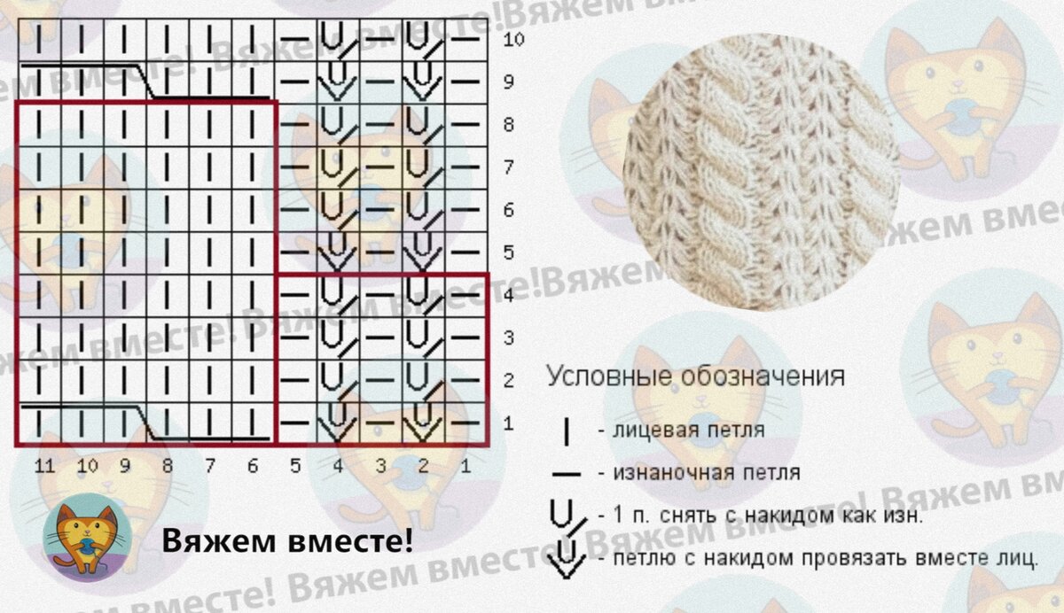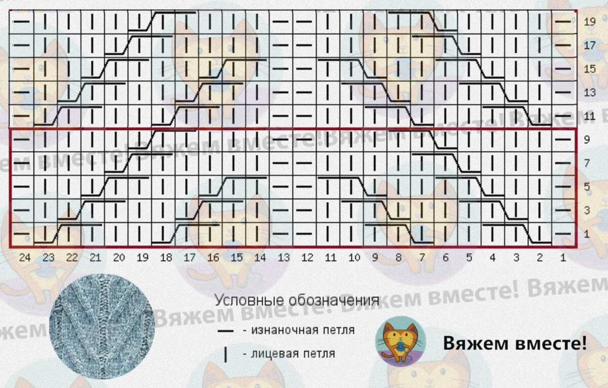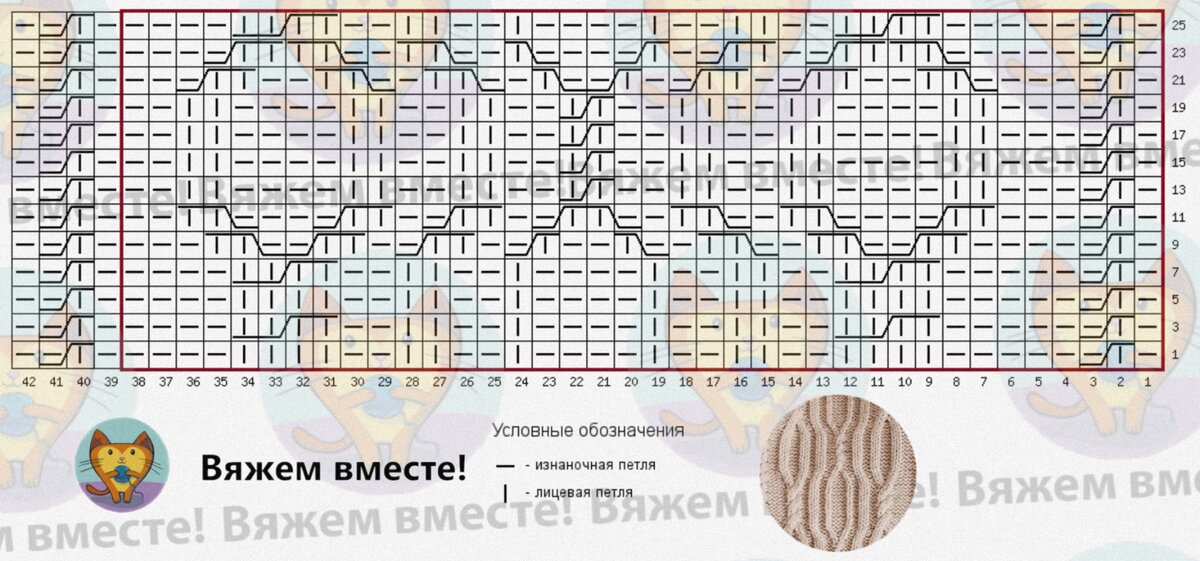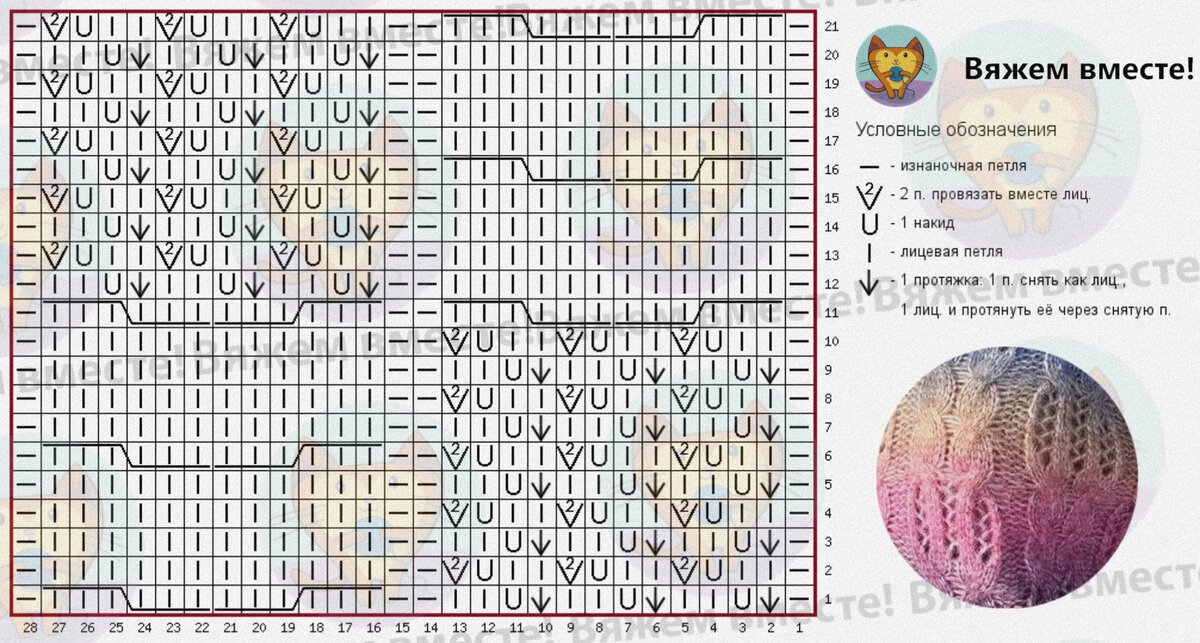 На схеме даны как нечётные, так и чётные ряды вязания, обозначения даны так, как петли лежат на лицевой стороне вязания.